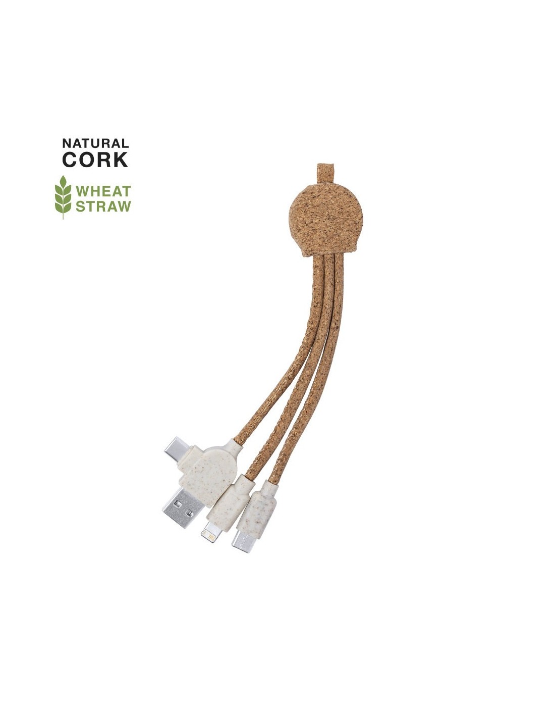 Cable cargador USB de línea nature, fabricado en corcho natural y con accesorios en caña de trigo, para así fomentar la utilización de materias primas naturales y reducir las emisiones contaminantes. Con conexiones USB, tipo C (entrada y salida) y dual micro USB-Lightning. Con accesorio para colgar y zona lisa para marcaje. Presentado en bolsa individual autocierre de diseño eco.