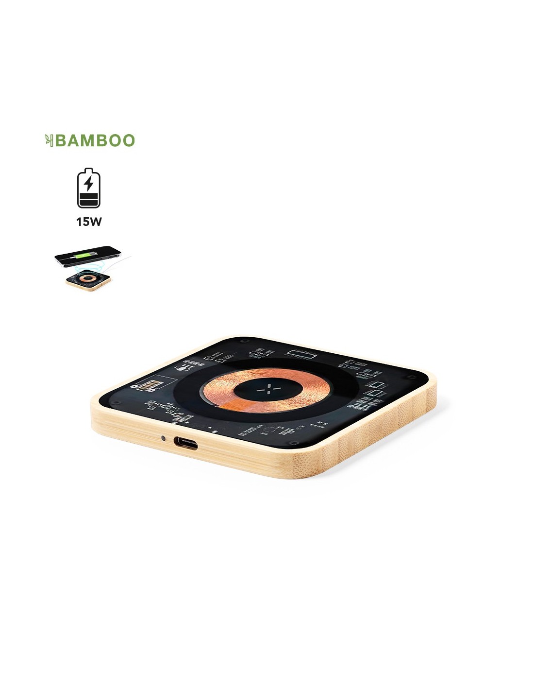 Cargador inalámbrico 15W de original diseño y superficie transparente que permite ver los componentes internos del dispositivo. Con base bambú cuadrada y compatible con dispositivos con tecnología Qi. Conexión Tipo C, con manual de instrucciones en español e inglés. Presentado en caja individual de diseño kraft.Materiales como el bambú fomentan la utilización de materias primas naturales, reduciendo las emisiones contaminantes. Proviene de una planta de gran resistencia y versatilidad, con crecimiento y regeneración rápidos, siendo una excelente alternativa al uso de madera tradicional.Fabricado conforme a los estándares RoHS y en cumplimiento con los siguientes requisitos de seguridad:Sistema de protección contra sobrecalentamiento.Sistema de protección contra sobrecarga.Sistema de bloqueo para evitar cortocircuitos.