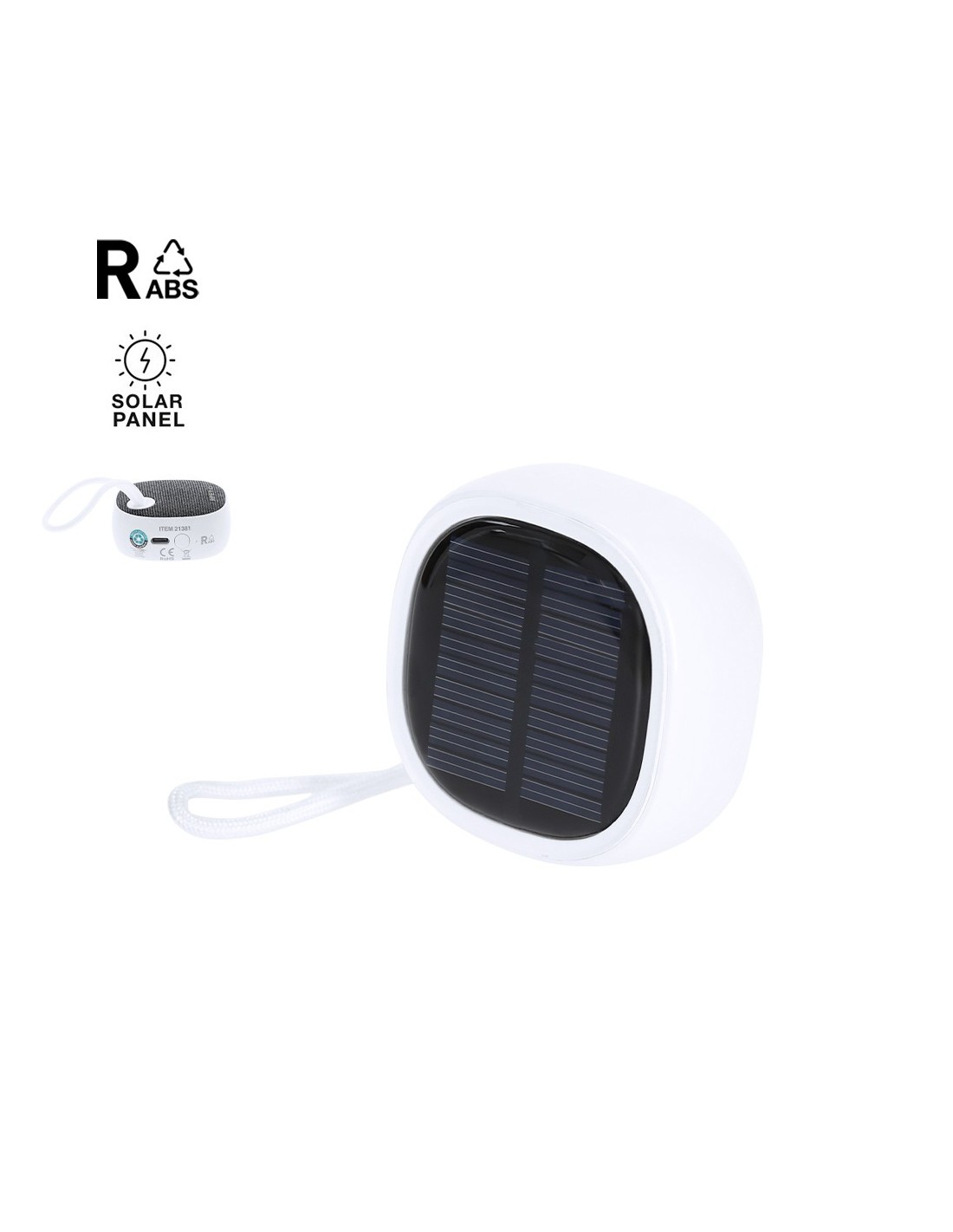 Altavoz solar fabricado en combinación de materiales reciclados (ABS Reciclado y RPET,NULL). Con 3W de potencia y conexión Bluetooth® 5.3. Cuenta con batería de litio, recargable mediante el panel solar o conexión USB Tipo C -cable incluido-. Con práctica asa de transporte y distintivo RCS.El RABS es un plástico altamente reciclable de gran resistencia y con multitud de aplicaciones que lo convierten en una solución eco-friendly. Con certificación RCS, que garantiza el origen reciclado del mismo.