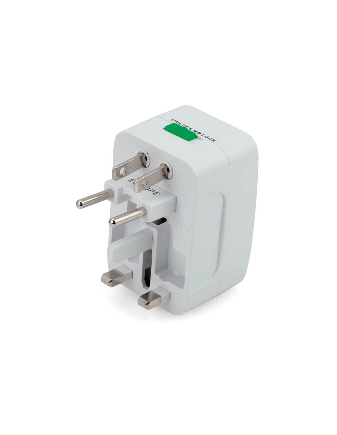Adaptador de enchufes retráctil, de diseño ultra compacto y portable. Especialmente indicado para viajeros, incluye adaptadores multi región para USA, Europa, Asia y Reino Unido. Presentado en caja individual.