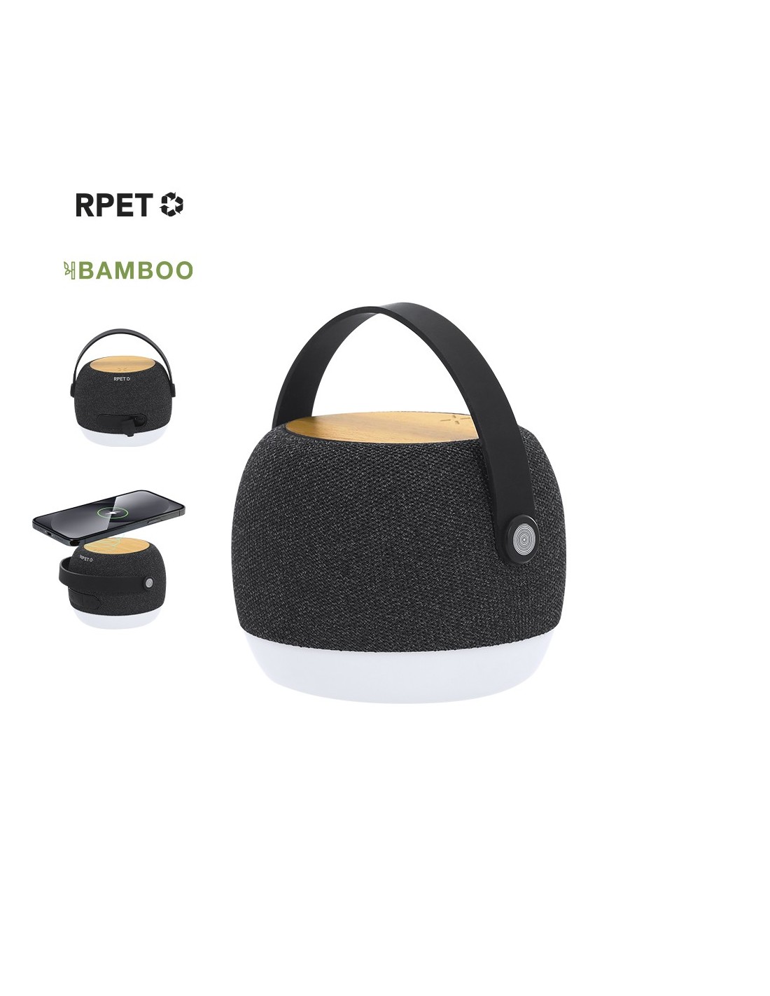 Altavoz cargador Bluetooth® con carga inalámbrica de 15W, fabricado en RPET y bambú. Equipado con un sistema de iluminación, con 12 LEDs, que se sincronizan con el ritmo de la música, creando ambientes vibrantes y envolventes. Incluye una práctica y suave asa de silicona para facilitar su transporte. Incluye distintivo RPET.El material RPET se elabora a partir de plástico reciclado, para así fomentar la reutilización de residuos plásticos y ayudar a la sostenibilidad del planeta.Materiales como el Bambú fomentan la utilización de materias primas naturales, reduciendo las emisiones contaminantes. Proviene de una planta de gran resistencia y versatilidad, con crecimiento y regeneración rápidos, siendo una excelente alternativa al uso de madera tradicional.