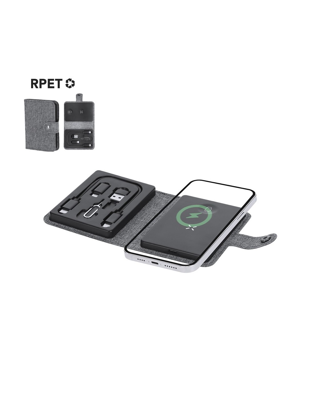 Completa base cargadora fabricada en 300D RPET. Estuche con cierre de corchete incluyendo base cargadora inalámbrica Qi para smartphone, auriculares y smartwatch. Contiene cable de conexión Tipo C en ambos extremos, además de adaptadores USB y lightning/micro USB. El set lo completa un eyector de tarjeta SIM y un compartimento para guardar una tarjeta Micro SIM. Con distintivo RPET.El material RPET se elabora a partir de plástico reciclado, para así fomentar la reutilización de residuos plásticos y ayudar a la sostenibilidad del planeta.