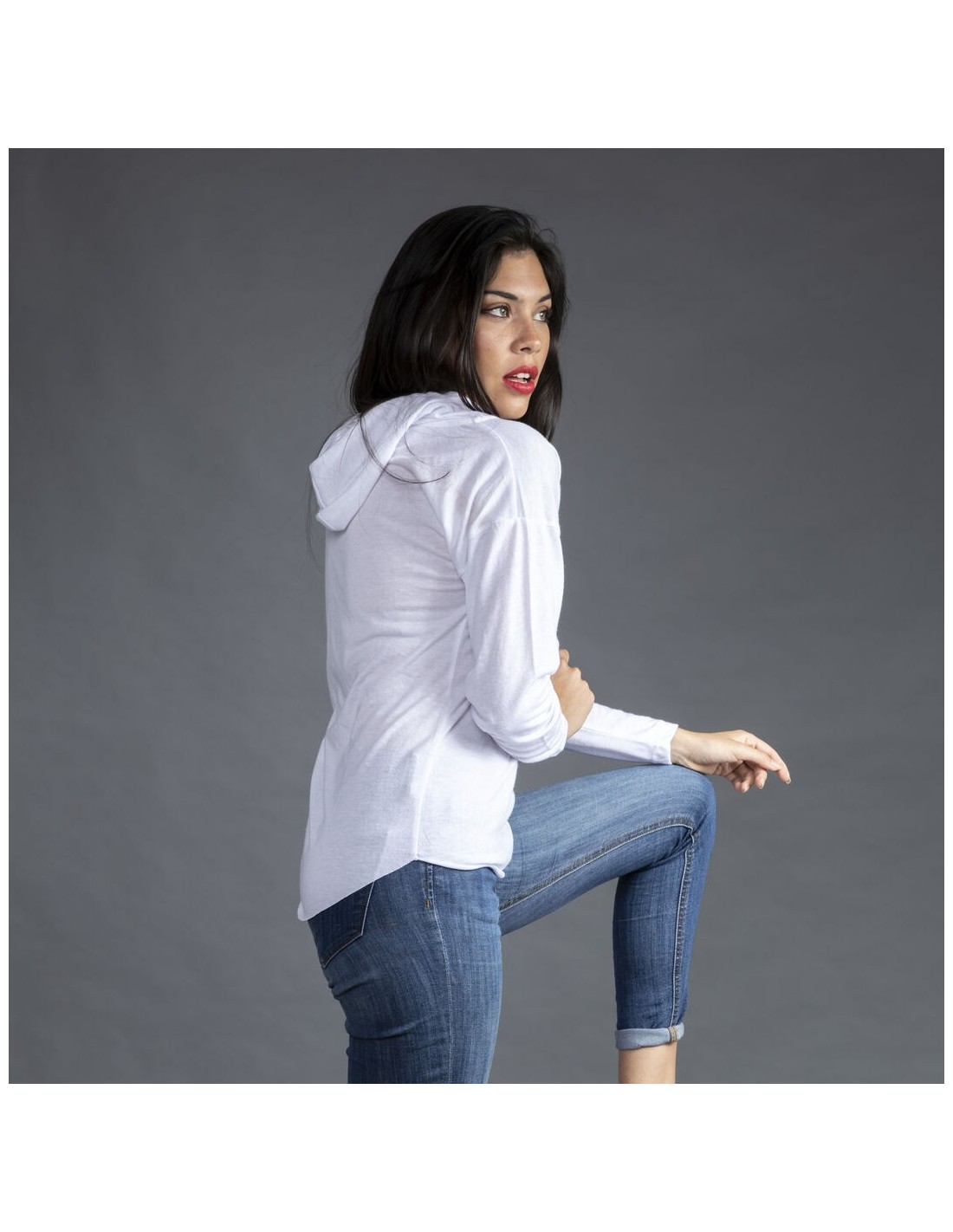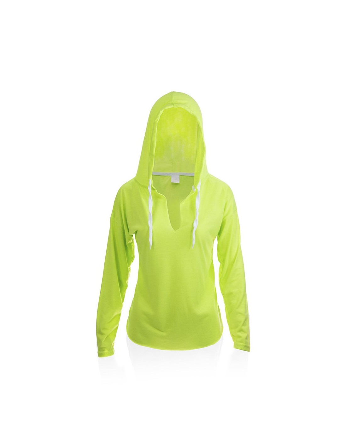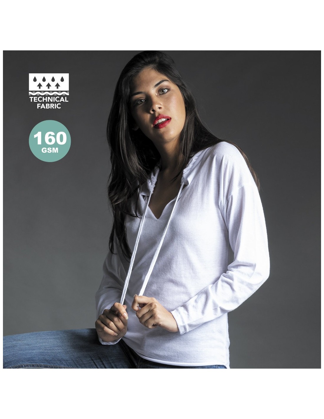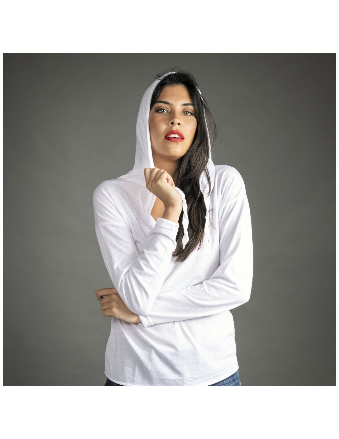 Original camiseta de manga larga en diseño unisex. En combinación de materiales algodón/poliéster de 160g/m2, con capucha y cierre ajustable de cordón. En variada gama de vivos colores y versión en amarillo fluorescente. Disponible en tallas S, M, L, XL.