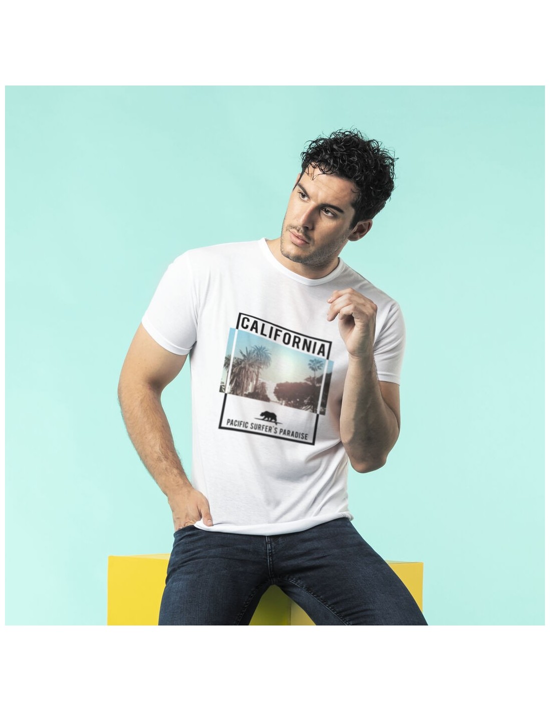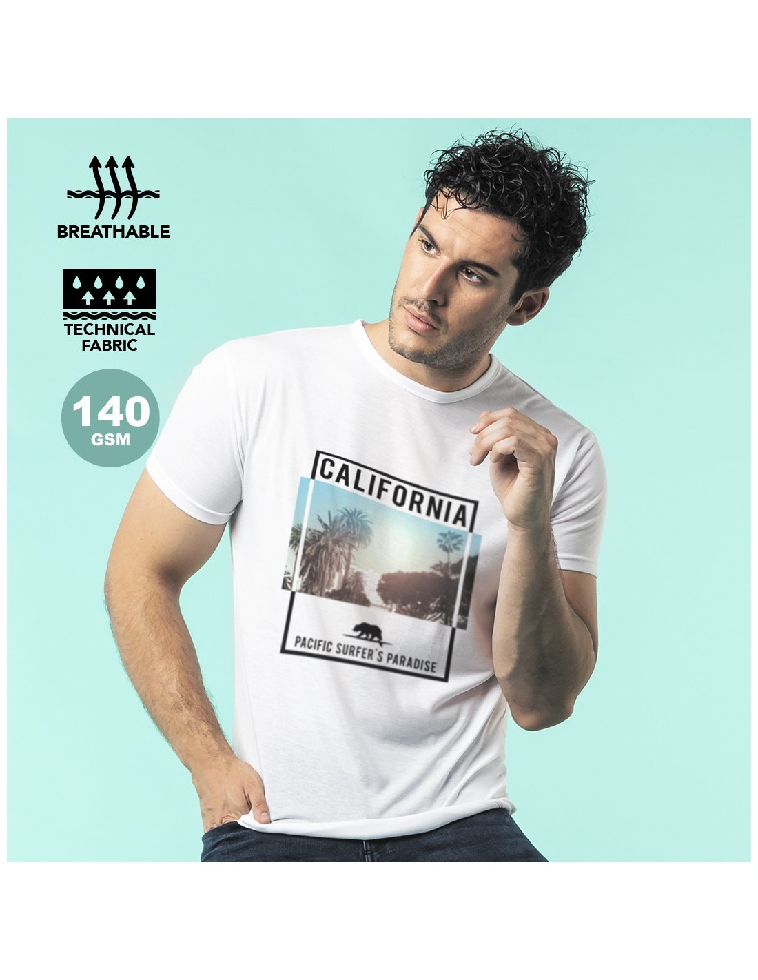 Camiseta para adulto en material 100% poliéster transpirable de 140g/m2 con textura de algodón. Especialmente diseñada para marcaje en sublimación y disponible en tallas S, M, L, XL, XXL.
