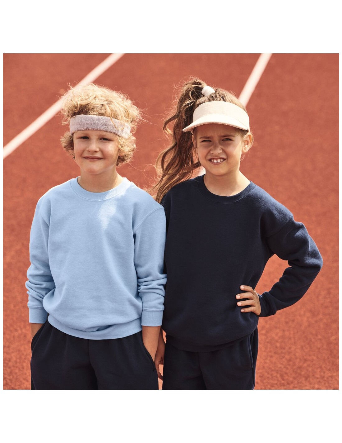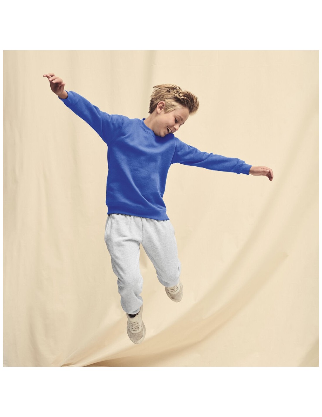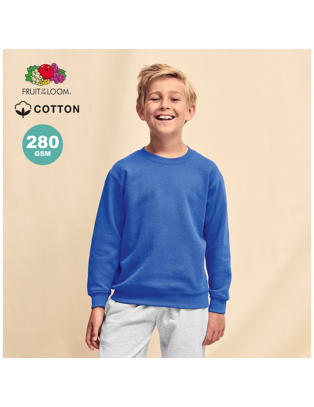 Sudadera para niño Classic Set-In Sweat de Fruit Of The Loom. Fabricada en combinación de materiales 80% algodón + 20% poliéster de 280g/m2. Con tapeta de hombro a hombro en punto liso y cuello, cintura y puños en algodón/ LYCRA®. Con etiqueta fácilmente removible y disponible en variada gama de colores. Tallas 3-4, 5-6, 7-8, 9-11, 12-13, 14-15.