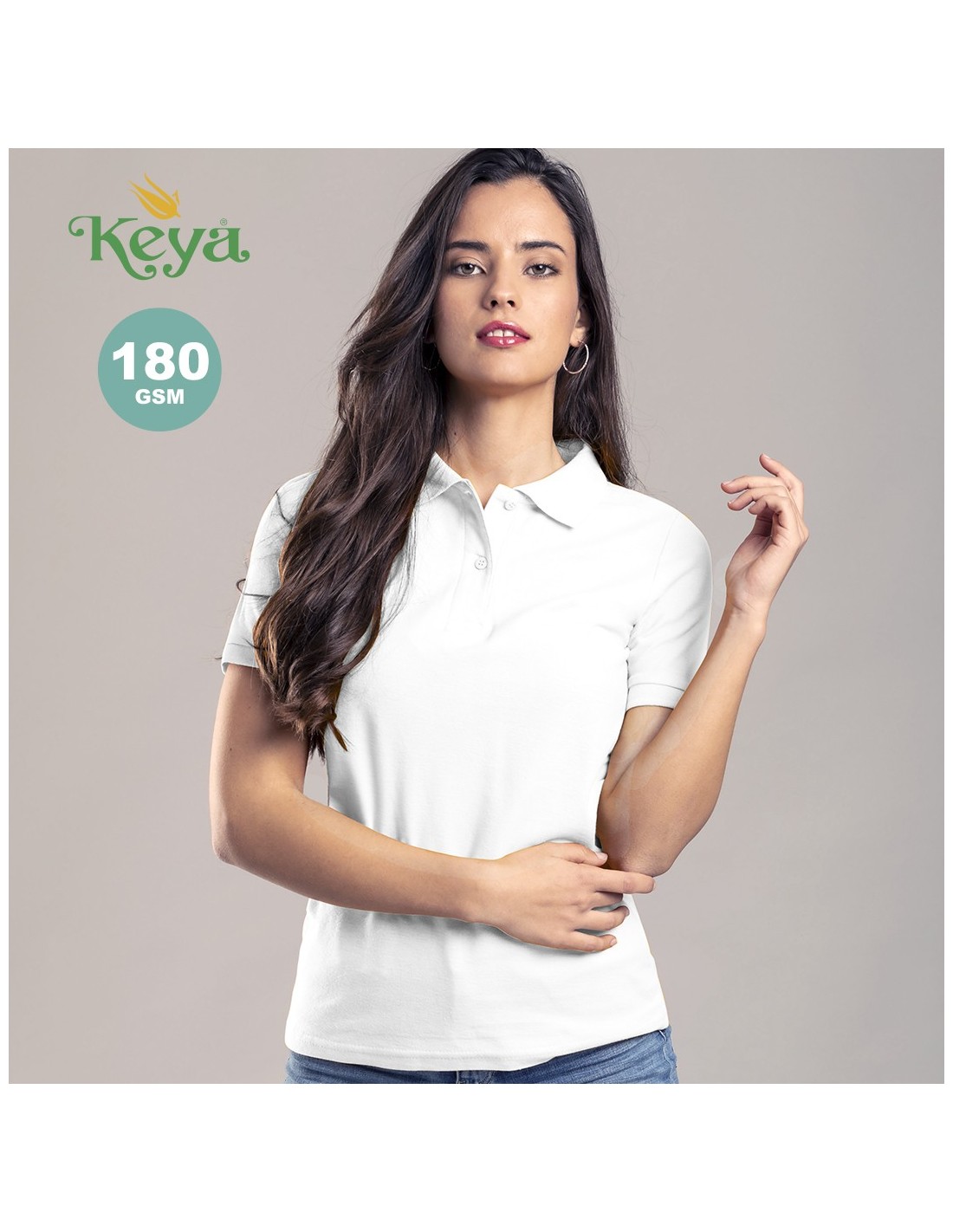 Polo de piqué para mujer de Keya WPS180. En material 100% algodón de 180g/m2. Con dos botones de cierre a juego y disponible en color blanco. Tallas S, M, L, XL, XXL.