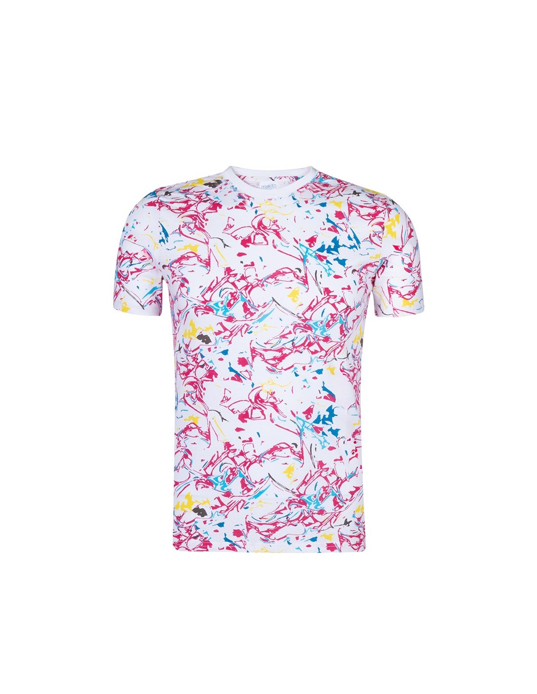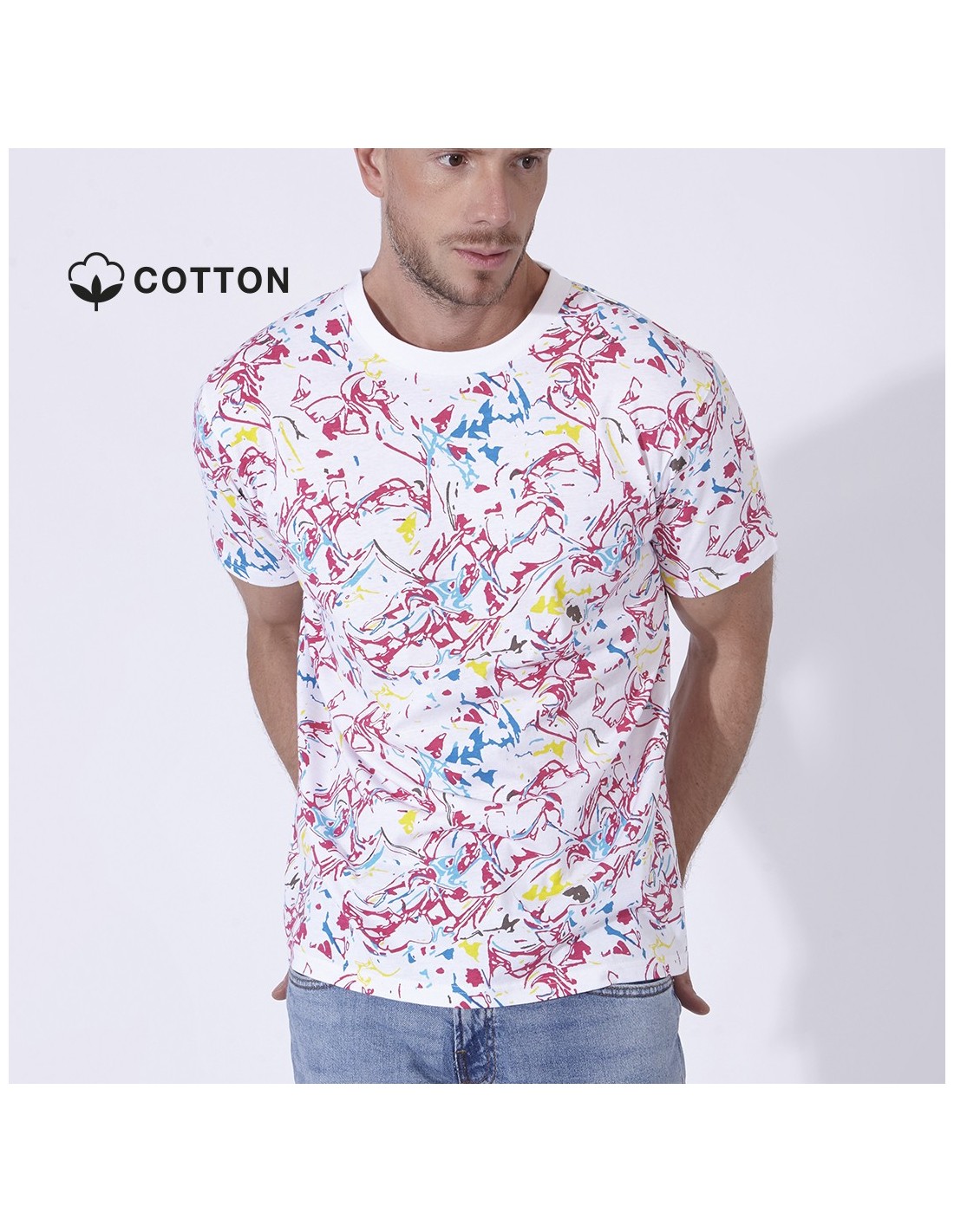 Camiseta unisex con estampado en colores vivos. Confeccionada en 100% algodón peinado Ring Spun de 150g/m2. Tacto suave y corte moderno. Cuello redondo estrecho en canalé 2x2. Doble costura en dobladillo y mangas para una mayor durabilidad y resistencia al uso intensivo. Etiqueta fácilmente removible. Disponible en tallas XS, S, M, L, XL y XXL.