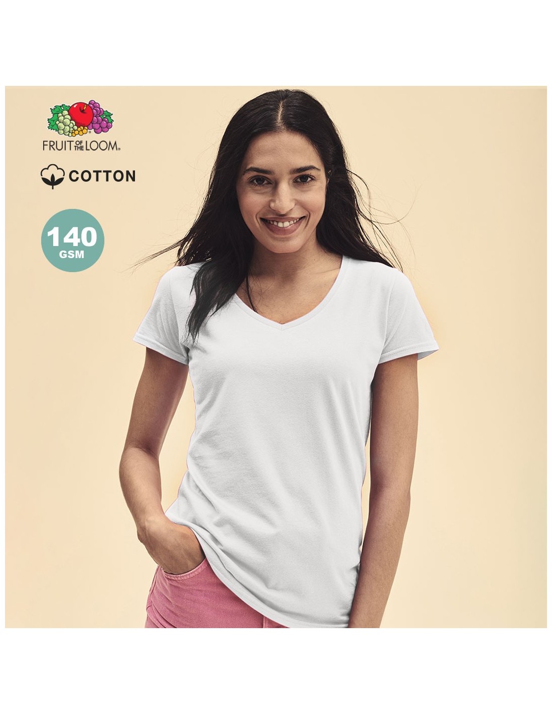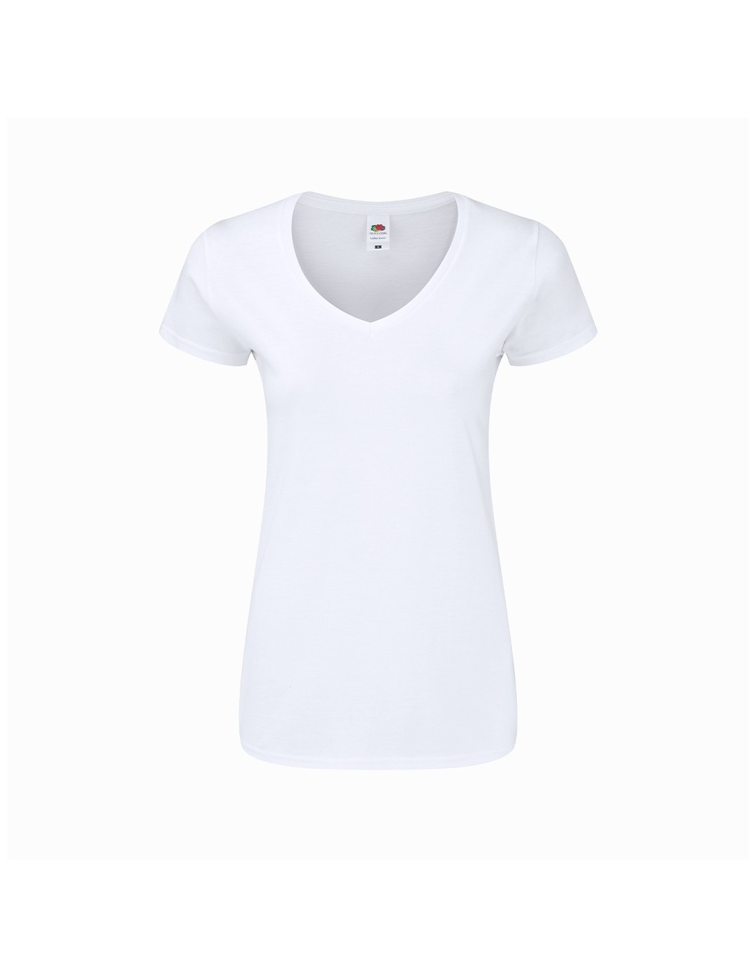 Camiseta para mujer blanca Iconic V-Neck de Fruit Of The Loom. Fabricada en material 100% algodón peinado Ring Spun de 140g/m2 hilado en anillo. De tacto suave y corte entallado, con costuras laterales diseñadas para un ajuste perfecto. Con cuello en pico estrecho de canalé 1x1 y tapeta a juego. Etiqueta fácilmente removible y disponible en tallas XS, S, M, L, XL, XXL.