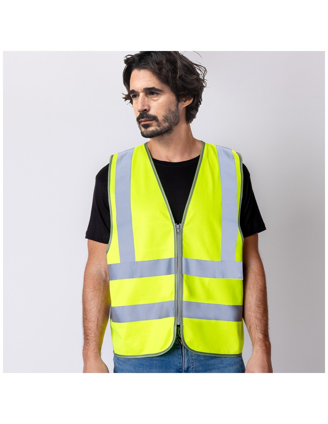 Chaleco reflectante de alta visibilidad, homologado según normativas de seguridad CE. Con doble tira reflectante alrededor del cuerpo, una tira vertical en cada hombro y cierres de cremallera. Talla única para adulto.