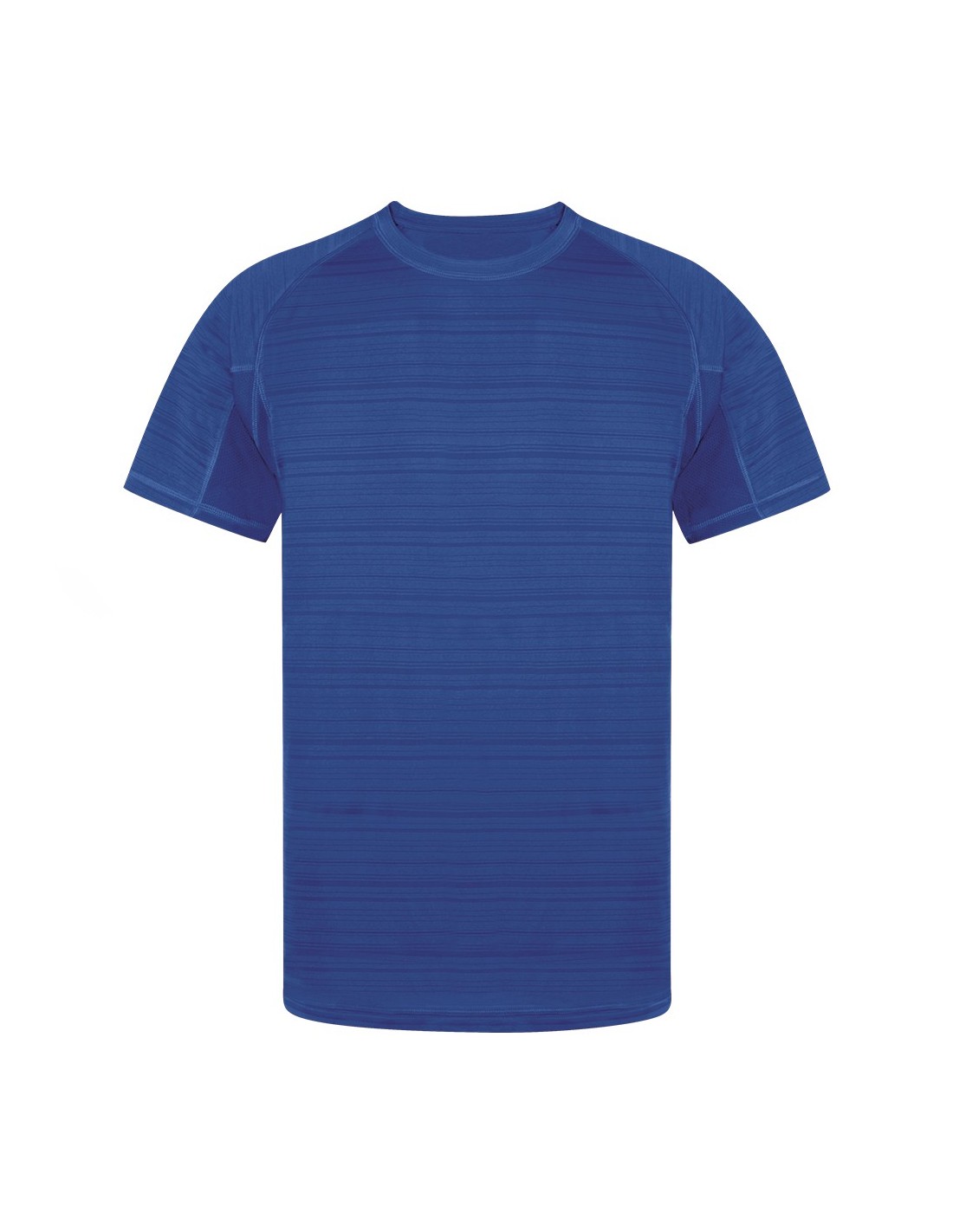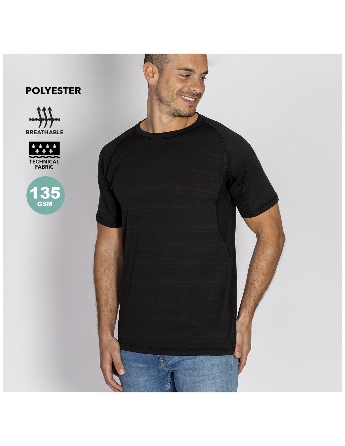 Camiseta técnica unisex con original diseño a rayas, en combinación con tejido transpirable microperforado en axilas y laterales. Confeccionada en suave material 100% poliéster de 135g/m2, siendo una camiseta muy cómoda, ligera y transpirable; ideal para la práctica de deporte y también como prenda de uso diario. De corte moderno, manga ranglán y cuello redondo, con doble costura en dobladillo y mangas de doble tejido para una mayor durabilidad y resistencia al uso intensivo. Disponible en tallas XS, S, M, L, XL y XXL.