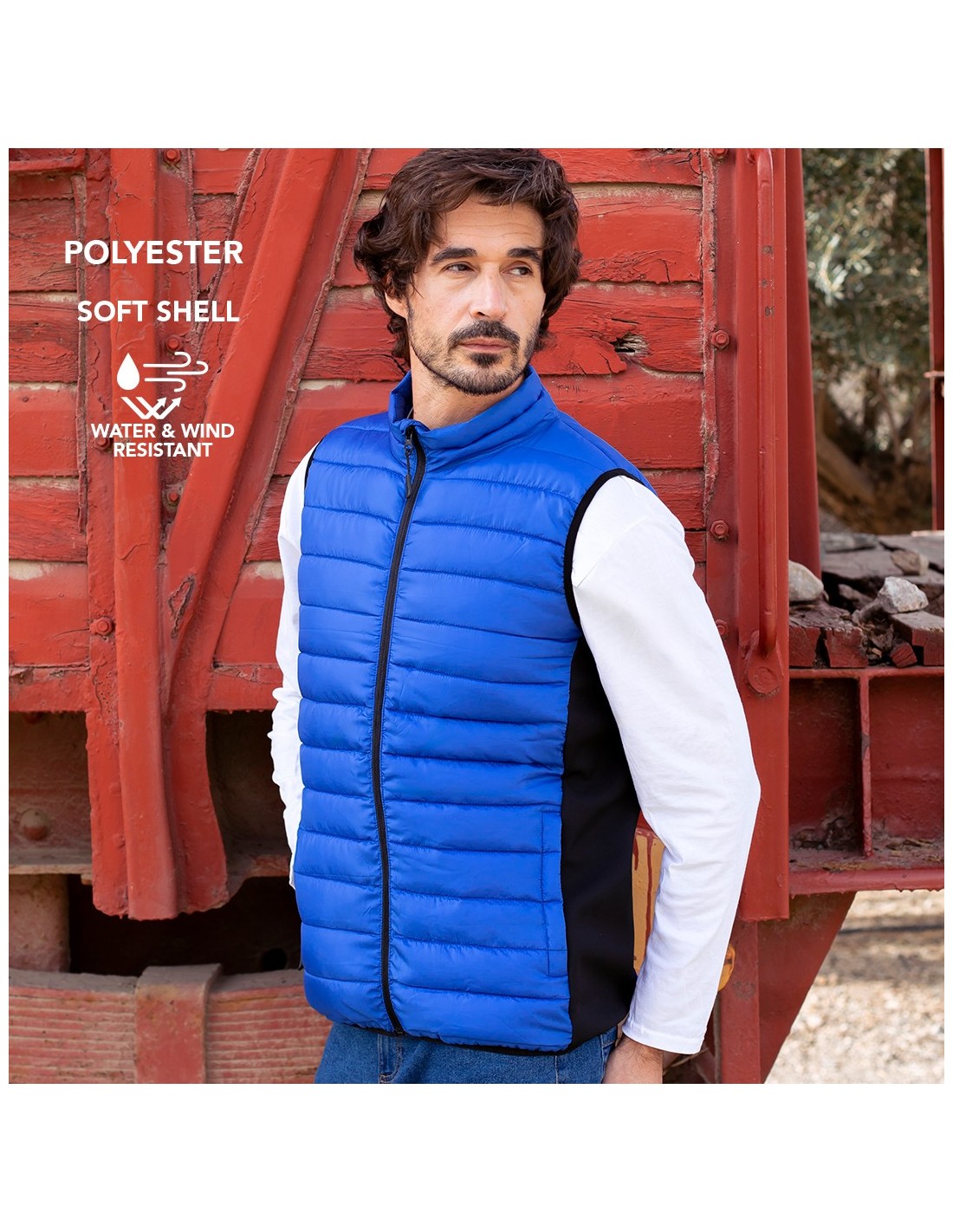Chaleco resistente al viento y al agua, en cálida combinación de materiales soft shell y poliéster, con interior acolchado. De elegante construcción y en variada gama de colores, con detalles y laterales en negro. Cierre de cremallera y bolsillos laterales de cremallera, con tiradores para fácil apertura. Disponible en tallas S, M, L, XL, XXL.