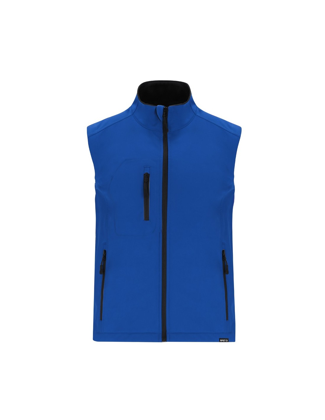 Chaleco Soft Shell RPET confeccionado en 3 capas, de 340 g/m2. Con membrana de 8000mm, impermeable y transpirable. Exterior en Soft Shell e interior en tejido polar microfleece en color negro. Con bolsillo exterior en pecho derecho y dos bolsillos laterales con cremalleras. Con cremallera central y cremalleras invertidas en bolsillos, incluyendo tiradores de cordón en color negro. Cuenta con protector de barbilla a juego y cintura ajustable, con cordón elástico y tope. Distintivo RPET en el ribete de la prenda.