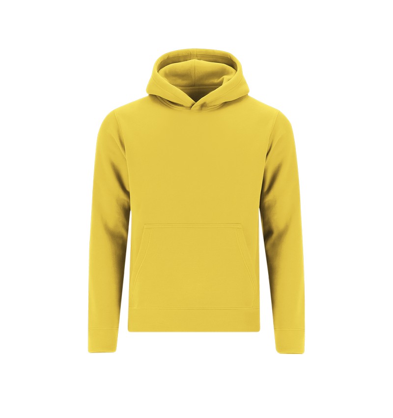 Sudadera infantil unisex con capucha forrada a tono de doble tejido. Confeccionada en algodón y poliester en suave felpa perchada de 280 g/m2. Con bolsillo tipo canguro. Cubrecosturas en el cuello. Puños y la cintura en punto canalé 1x1 con elastano para mayor ajuste y confort.
