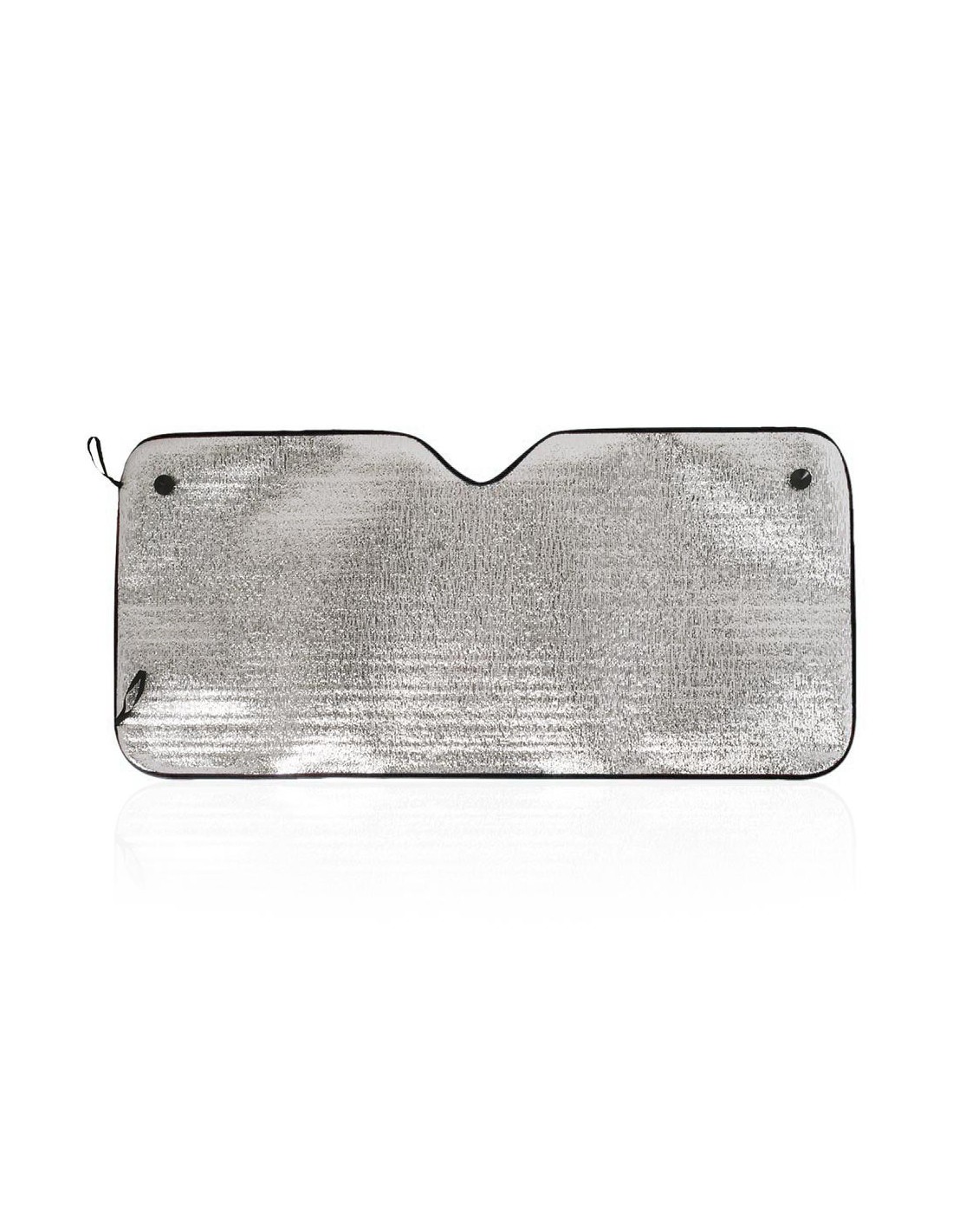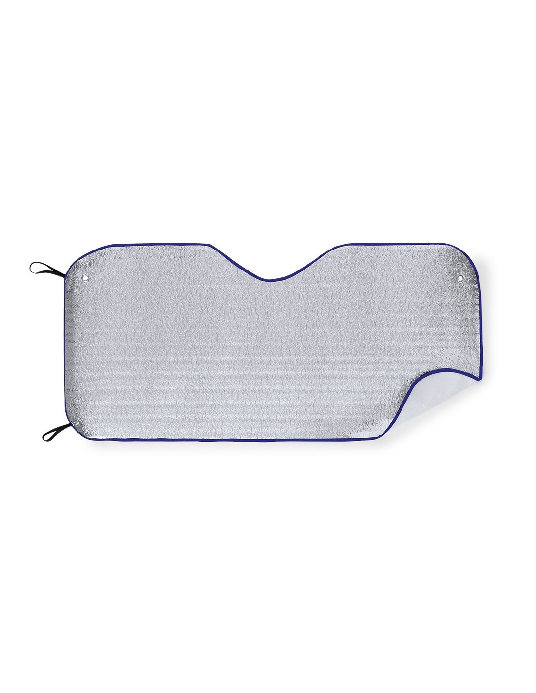 Parasol en aluminio a una cara en color plateado de acabado metalizado con ribetes de poliéster en vivos colores. De tamaño 130x60cm y espuma en el reverso. Cintas elásticas de ajuste con argollas metálicas de refuerzo, dos ventosas para ajuste en luna y