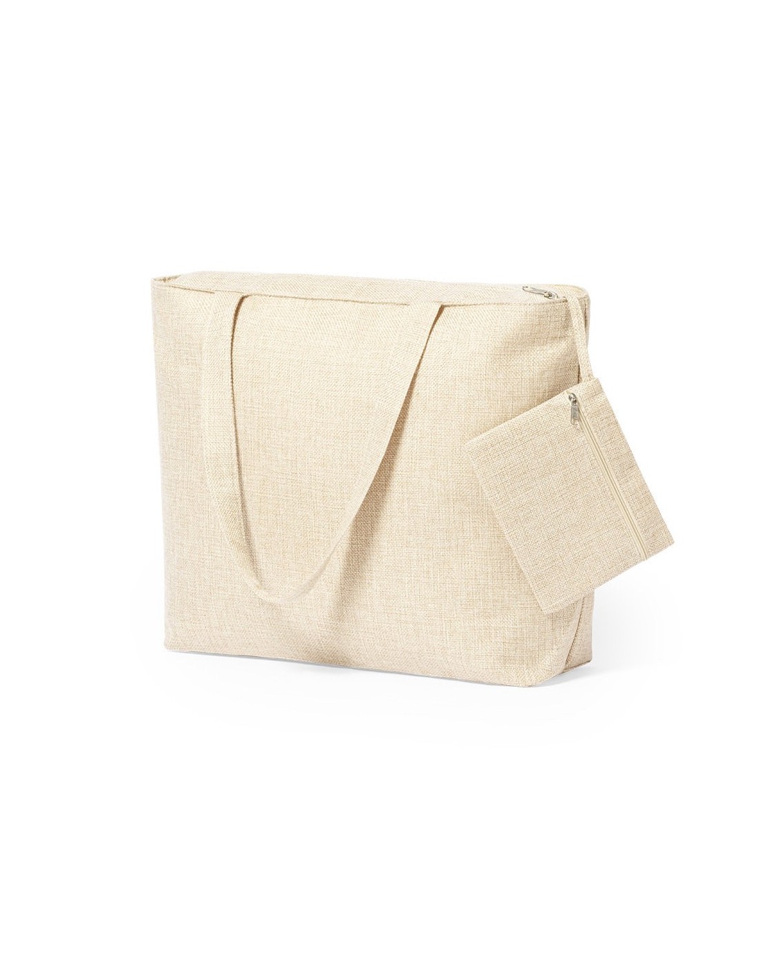 Original bolsa con neceser a juego, fabricada en resistente poliéster de acabado natural. Compartimento principal y neceser interior con cierre de cremallera. Con asas medianas de 56 x 3 cm a juego.