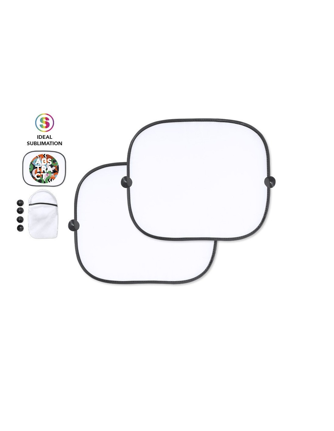 Original set de 2 parasoles plegables para ventanilla, fabricados en resistente poliéster. Ligeros y en medidas 44 x 36 cm cada uno, con ribetes reforzados y fijación por ventosas (4 unidades incluidas). Con sencillo sistema de plegado y funda individual a juego. Color blanco especial para sublimación.