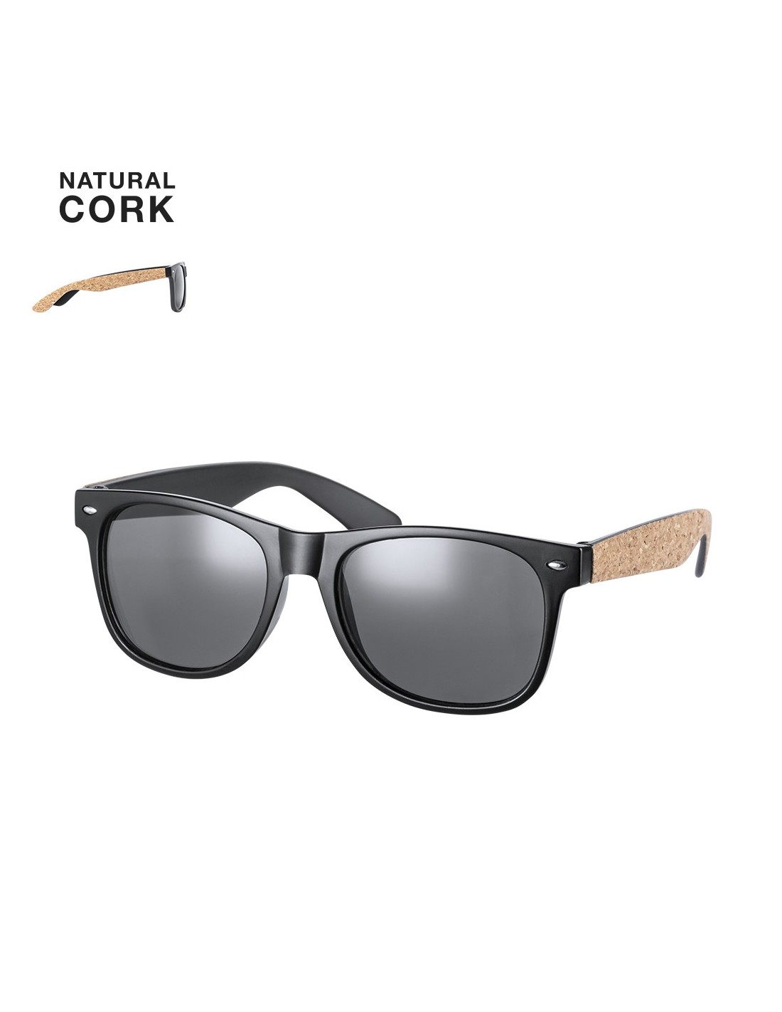 Gafas de sol de línea nature con protección UV400. Montura negra en resistente material PC, con lentes tintadas a juego y patas con recubrimiento de corcho natural. Presentadas en atractivo estuche de diseño eco.