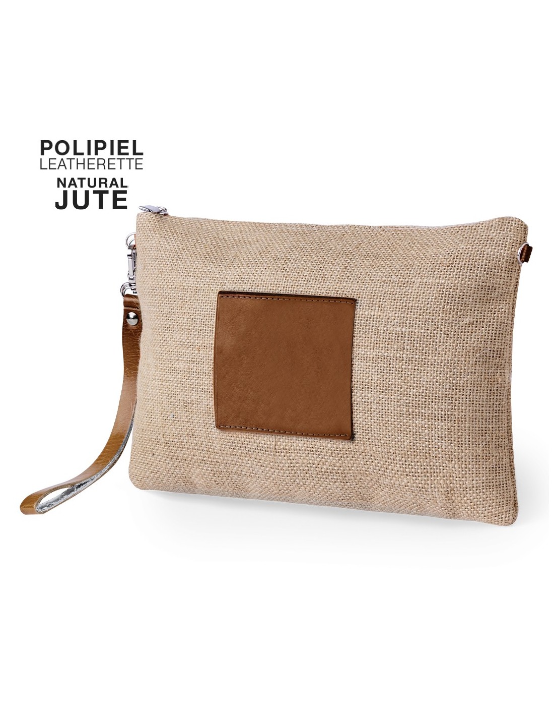 Neceser multiusos en combinación de yute laminado y polipiel. Con cierre de cremallera, tirador metálico y marco central a juego en polipiel de color natural. Presentado en bolsa individual.