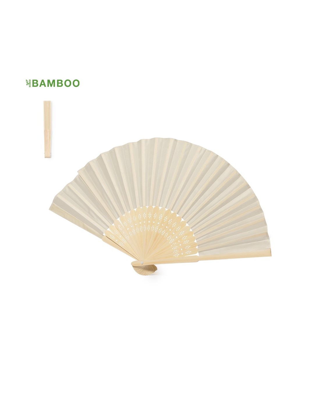 Abanico fabricado con varillas de bambú y tela de poliéster. En tonos naturales y presentado en caja individual diseño kraft..Materiales como el bambú fomentan la utilización de materias primas naturales, reduciendo las emisiones contaminantes. Proviene de una planta de gran resistencia y versatilidad, con crecimiento y regeneración rápidos, siendo una excelente alternativa al uso de madera tradicional.