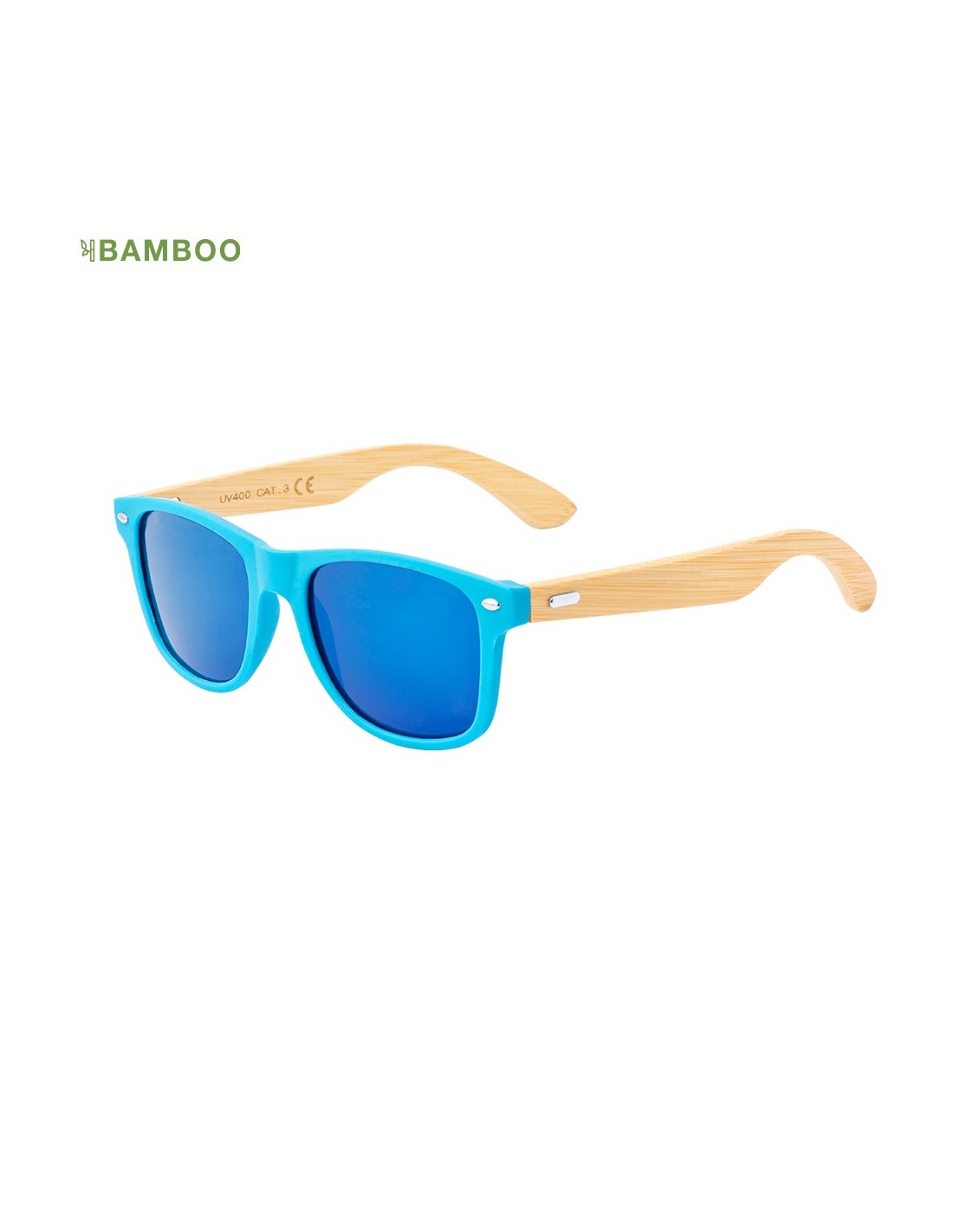 Gafas de sol fabricadas en bambú con protección UV400. Montura de colores en resistente material PC y patillas en bambú. Lentes AC (acetato de celulosa) de acabado espejo, disponibles en variada gama de colores en combinación con la montura. Presentada en atractiva bolsa de papel diseño kraft..Materiales como el bambú fomentan la utilización de materias primas naturales, reduciendo las emisiones contaminantes. Proviene de una planta de gran resistencia y versatilidad, con crecimiento y regeneración rápidos, siendo una excelente alternativa al uso de madera tradicional.