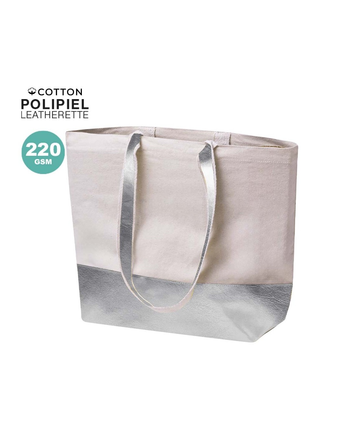 Bolsa en material 100% algodón reciclado de 220 g/m2 en combinación con polipiel metalizada. Con fuelle y asas largas de 70cm, disponibles en dorado, plateado y oro rosa, con base a juego. Resistencia hasta 8 kg de peso.