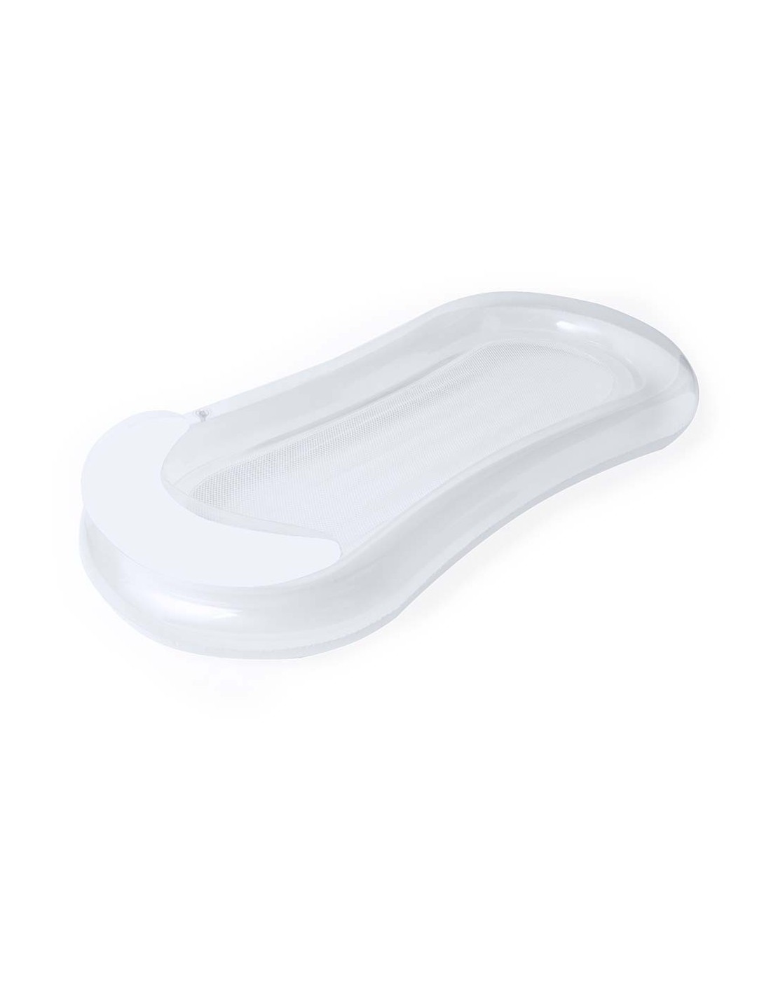 Original colchoneta en resistente PVC. Incluye una cómoda almohada para la cabeza, con diseño bitono, en colores transparente y blanco. Incluye una resistente redecilla central en poliéster de color blanco. Con plegado especial para fácil impresión. Se sirve desinflada y en una práctica bolsa individual reciclada.