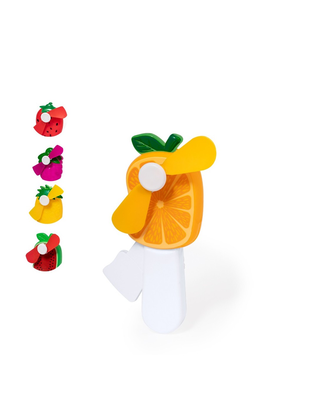 Ventilador en divertidas formas de fruta, fabricado en resistente ABS. Funcionamiento manual, apretando apretando continuamente en la palanca integrada en el mango para poder mover las aspas. Disponible en diseños fresa, piña, uva, sandía o naranja. Presentado individualmente en bolsa reciclada.