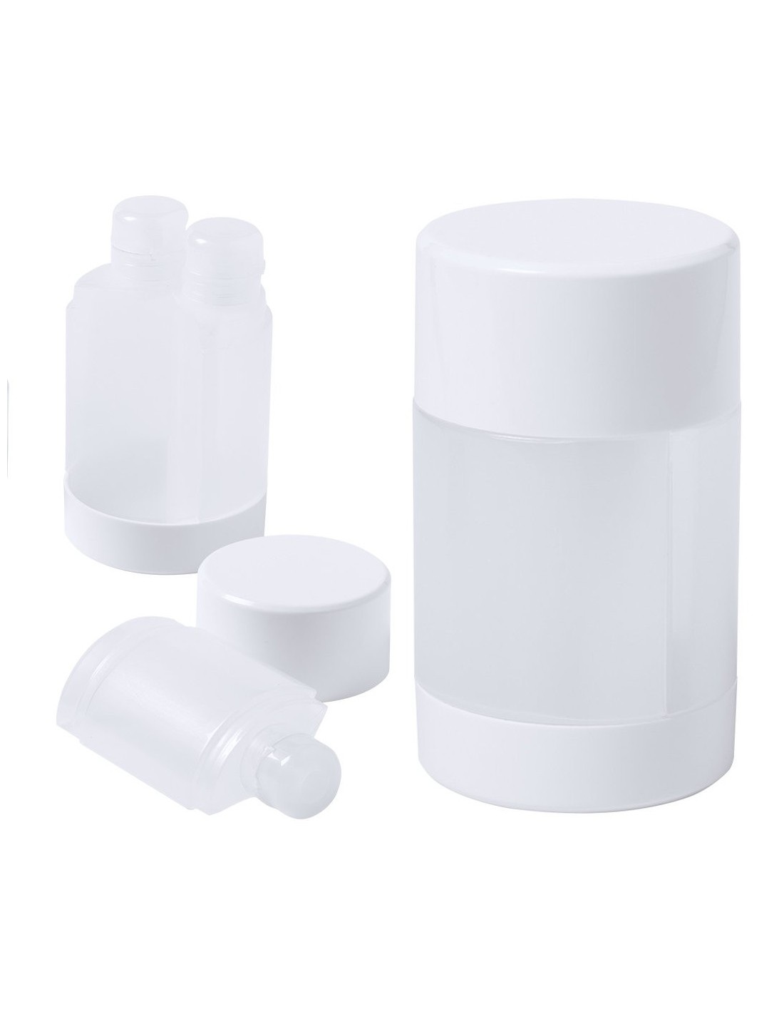 Set de viaje de 3 accesorios en resistente PP. Incluye 3 botes para gel y champú con cierre hermético. Presentado en estuche de original diseño.
