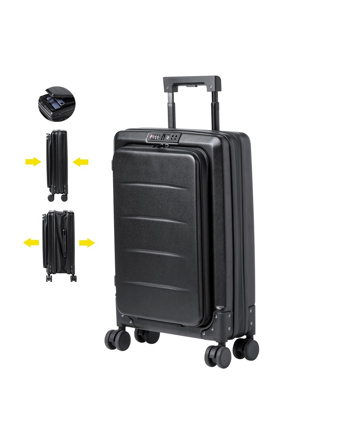 Práctico trolley plegable de 4 ruedas giratorias, en rígido ABS. Con la posibilidad de poder ampliar su capacidad por su parte central extensible, con cierre de cremallera de doble tirador. Equipado con un bolsillo acolchado para portátil de hasta 15 pulgadas y bolsillo para tables de hasta 1 pulgadas, en la parte frontal. Cierre conforme a los estándares TSA -Administración de la Seguridad en el Transporte-, que permite a las autoridades de aduanas inspeccionar el contenido del equipaje sin tener que forzar o romper el cierre, a traves de una llave especial a disposición de la autoridad.