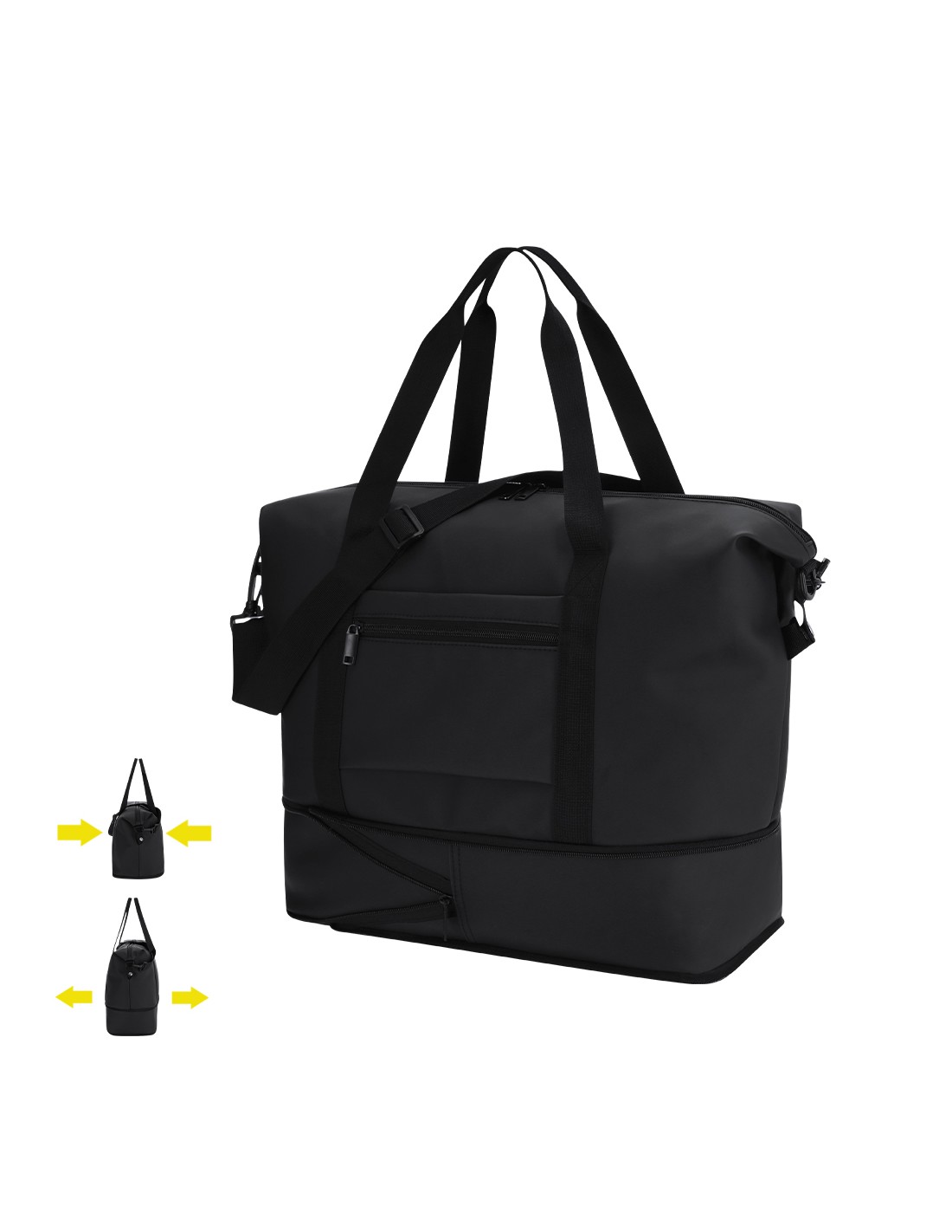 Bolso extensible confeccionado en suave PU, diseñado para ofrecer una solución práctica y versátil. Cuenta con bolsillo frontal para trolleys y maletas, aportando funcionalidad durante su transporte. Sistema de cierre mediante tiradores metálicos. Incluye asas de transporte y correa ajustable para el hombro.