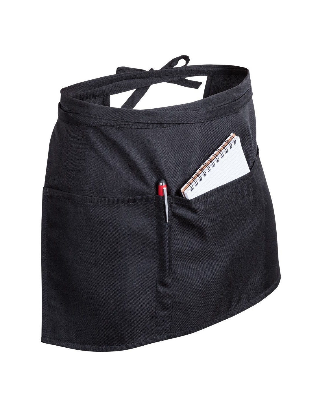Delantal para cintura en material 100% poliéster de suave acabado en elegante color negro. Con 2 bolsillos grandes, bolsillo mediano y funda par bolígrafo. Ajustable mediante cintas.