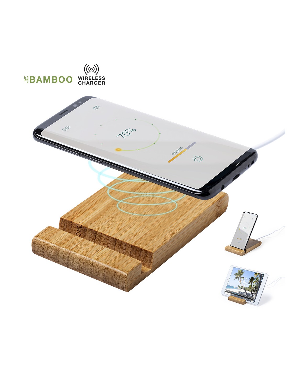 Cargador inalámbrico 5W de línea nature, con soporte integrado para smartphones y tablets. Carcasa en bambú procedente de cortes naturales. Incluye cable micro USB de 1m y es compatible con dispositivos equipados con tecnología de carga inalámbrica. Con amplia superficie de marcaje, presentado en atractiva caja de diseño eco.