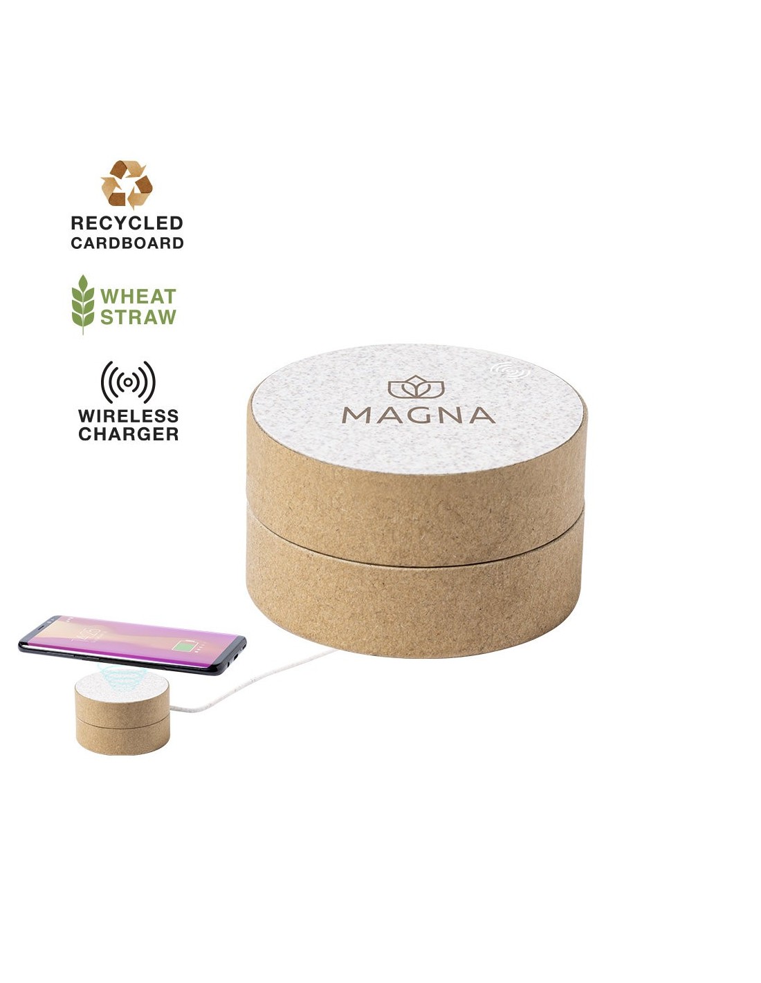 Original cargador inalámbrico circular de línea nature. Carcasa en cartón reciclado, contribuyendo a la conservación de los bosques y reduciendo considerablemente la huella de carbono, con superficie de carga y cable en caña de trigo. Compartimento interior para guardar el cable y poder llevarlo a cualquier lado. Indicador LED de estado de carga, compatible con smartphones con tecnología de carga inalámbrica y presentado en atractiva caja de diseño eco, con manual de instrucciones en español e inglés.