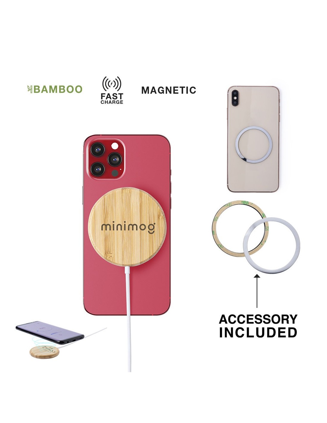 Cargador inalámbrico magnético 10W de línea nature, con carcasa fabricada en resistente bambú. Con indicador de estado de carga y cable USB de 1m. Incluye accesorio metálico con adhesivo 3M, de fijación extra fuerte y libre de residuo al despegarlo del dispositivo, permitiendo así el uso de la función magnética del cargador en cualquier dispositivo móvil. Compatible con terminales equipados con tecnología de carga inalámbrica. Amplia superficie de marcaje y presentado en atractiva caja de diseño eco. Disponible manual de instrucciones en español e inglés.