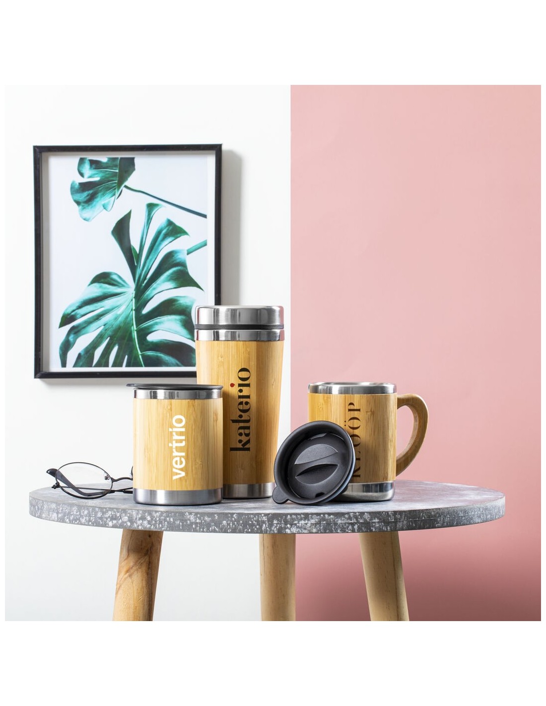 Taza de línea nature y 300ml de capacidad. Cuerpo en combinación bambú y acero inox de doble pared para mejor y más duradera conservación de la temperatura. Con original tapón dosificador y presentado en atractiva caja de diseño eco.
