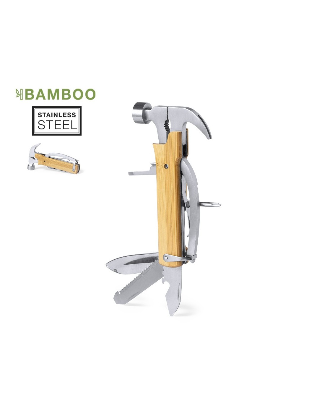 Multiherramienta de línea nature, con resistente cuerpo en acero inox y empuñadura de bambú. Con 13 funciones, entre otras martillo y sacaclavos; cuchillo y cortauñas; destornillador plano y philips; lima; abridor y alicates. Cordón a juego en polipiel y presentada en caja individual de diseño kraft.