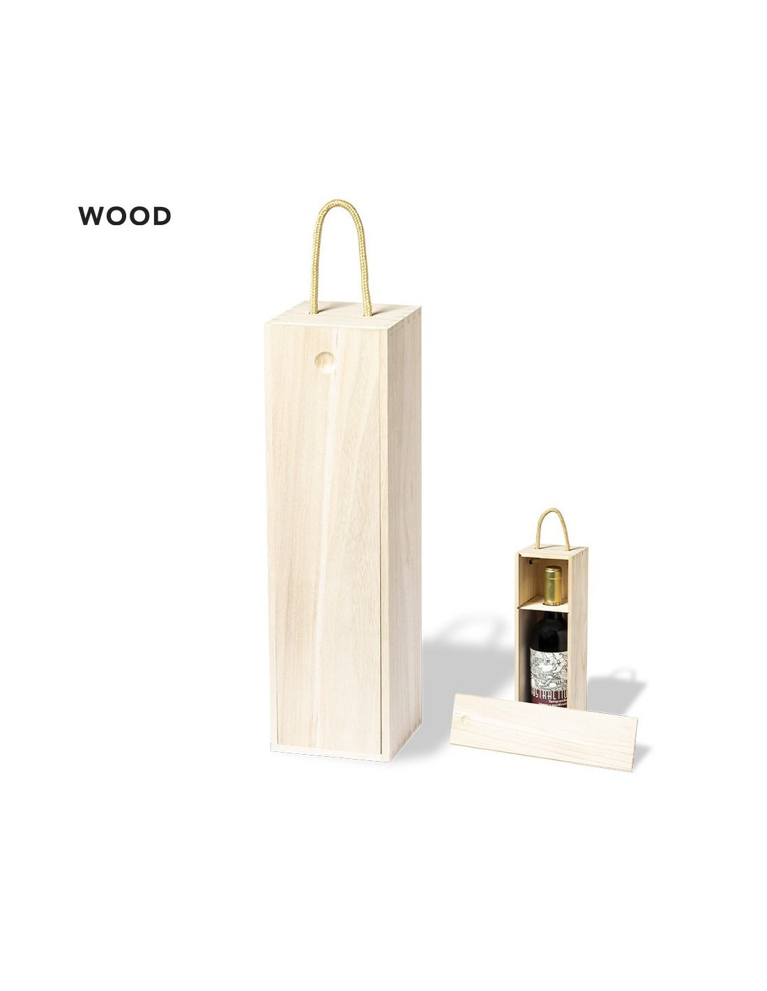 Caja de presentación premium para 1 botella, fabricada en madera natural de Paulownia, ligera y resistente. Interior con sujeción de seguridad para el cuello de la botella, con tapa deslizante y cordón de transporte.