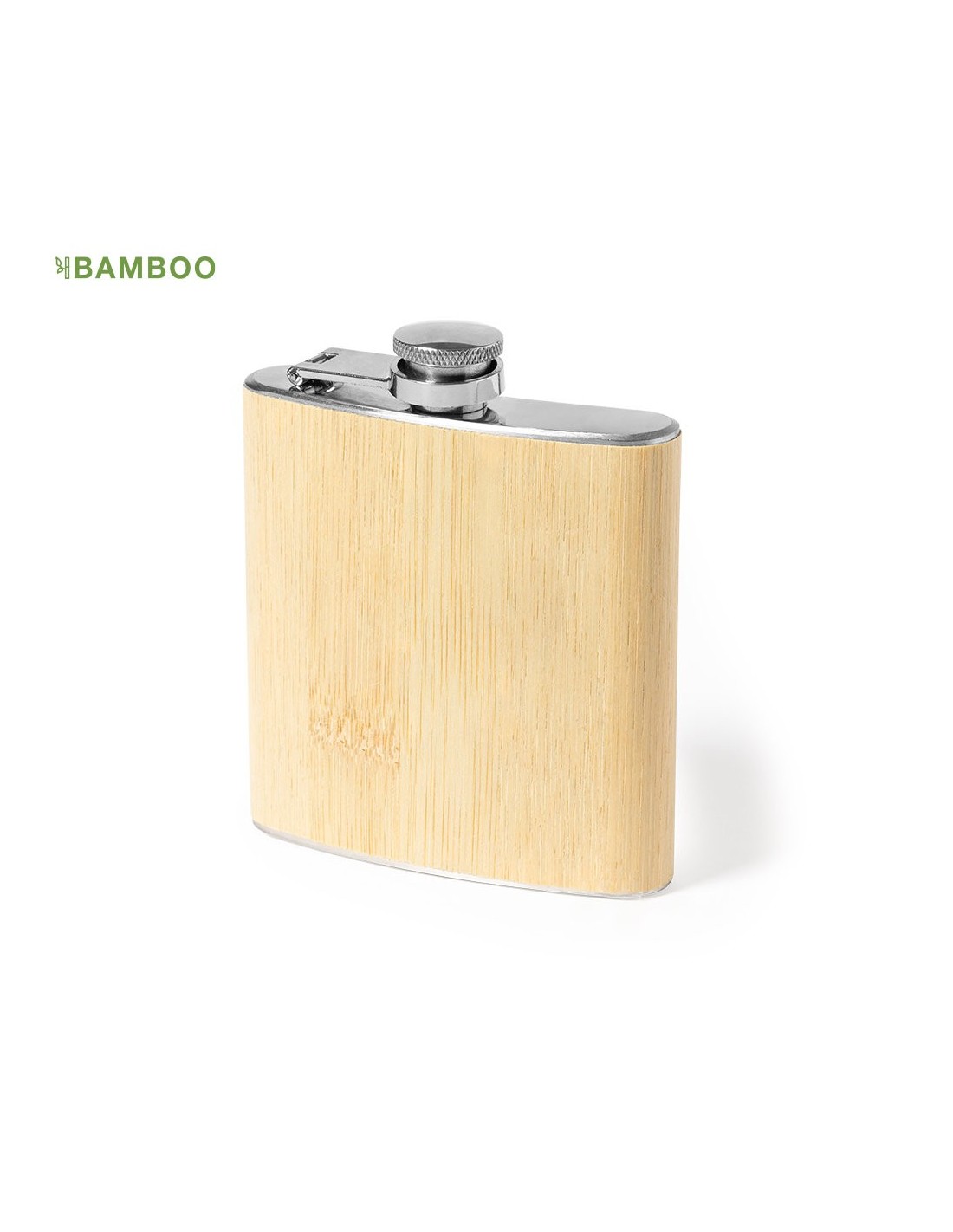 Petaca de línea nature y 200 ml de capacidad. Exterior en bambú de suave acabado, con cuerpo de acero inox y tapón de seguridad a rosca. De diseño ergonómico para guardar cómodamente en el bolsillo. Presentada en caja individual de diseño eco en cartón kraft.