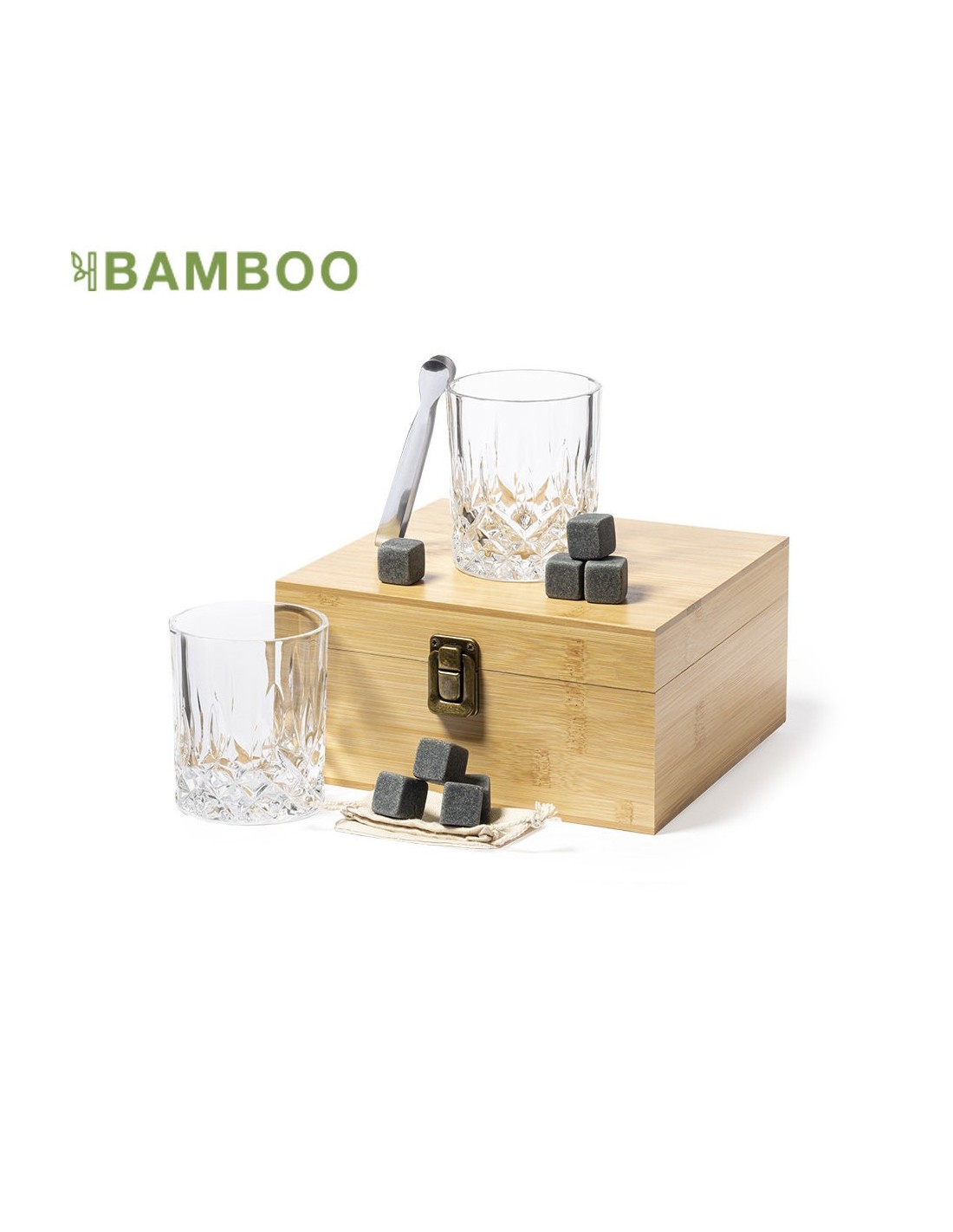 Set de whisky en elegante estuche de bambú con interior troquelado. Incluye 2 vasos de cristal de 320 ml, pinzas y 8 cubitos en piedra natural reutilizables, con funda de algodón. Presentación en caja individual de diseño kraft. Los cubitos reutilizables están fabricados en piedra natural esteatita, también conocida como piedra o roca de jabón, que mantiene la bebida fría sin alterar sus propiedades al no diluir su contenido en agua, además de mantener el sabor original de la misma.