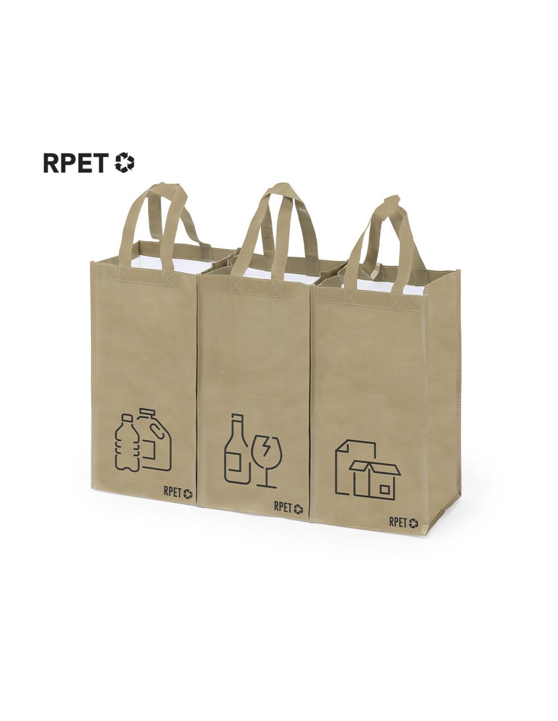 Set de 3 bolsas de reciclaje. Fabricadas en resistente poliéster RPET laminado, elaborado a partir de plástico reciclado, para así fomentar la reutilización de residuos plásticos y ayudar a la sostenibilidad del planeta. Incluye 3 bolsas de 23x45x23 cm unidas entre sí mediante velcros laterales. Con asas reforzadas e indicación de tipos de residuo: plásticos y envases; vidrio, y papel. Distintivo RPET en la base de cada bolsa.