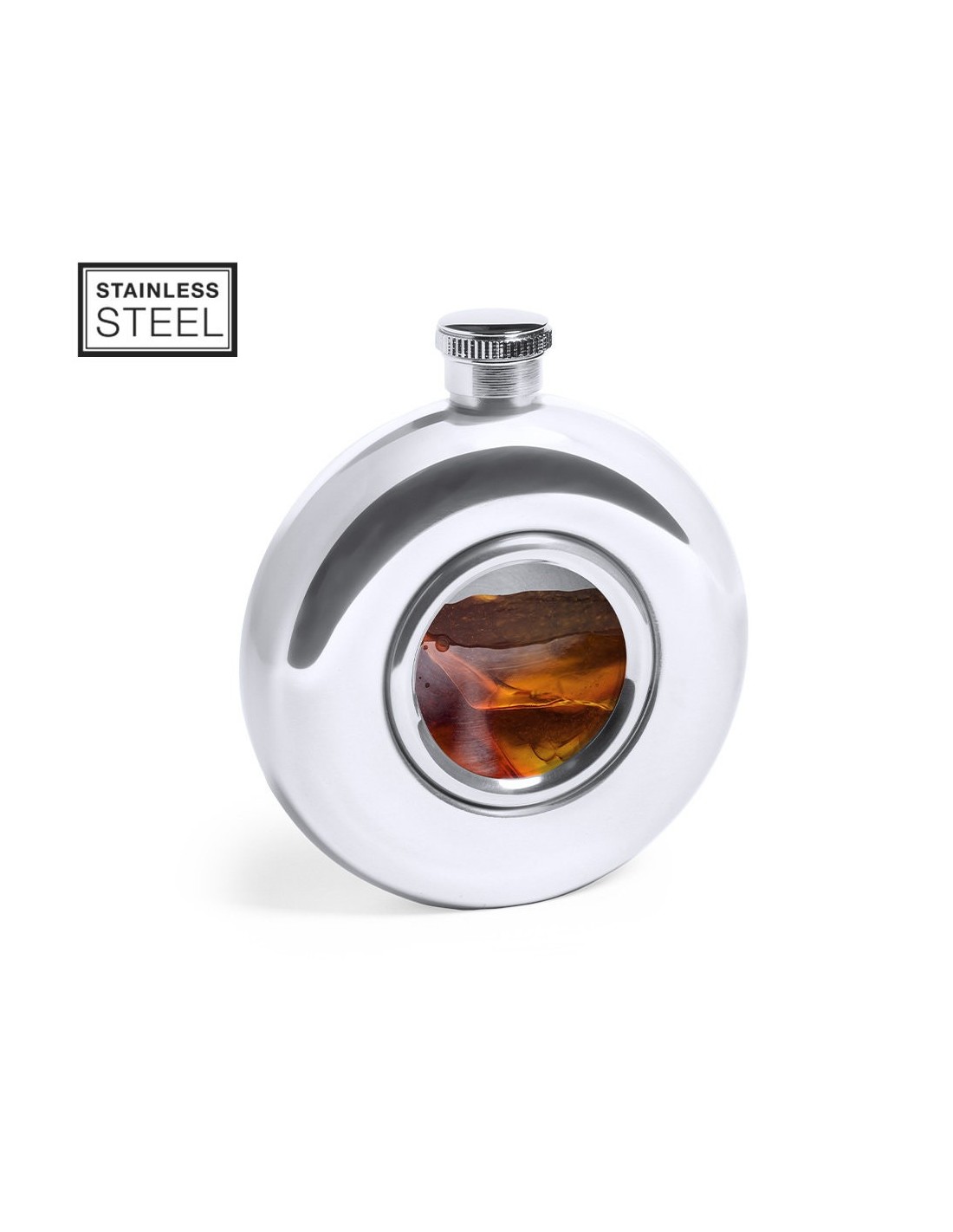 Práctica petaca de diseño circular, fabricada en acero inox de acabado cromado. 150 ml de capacidad, con tapón a rosca de seguridad y ventana transparente en un lado. Presentación en caja individual de diseño kraft.