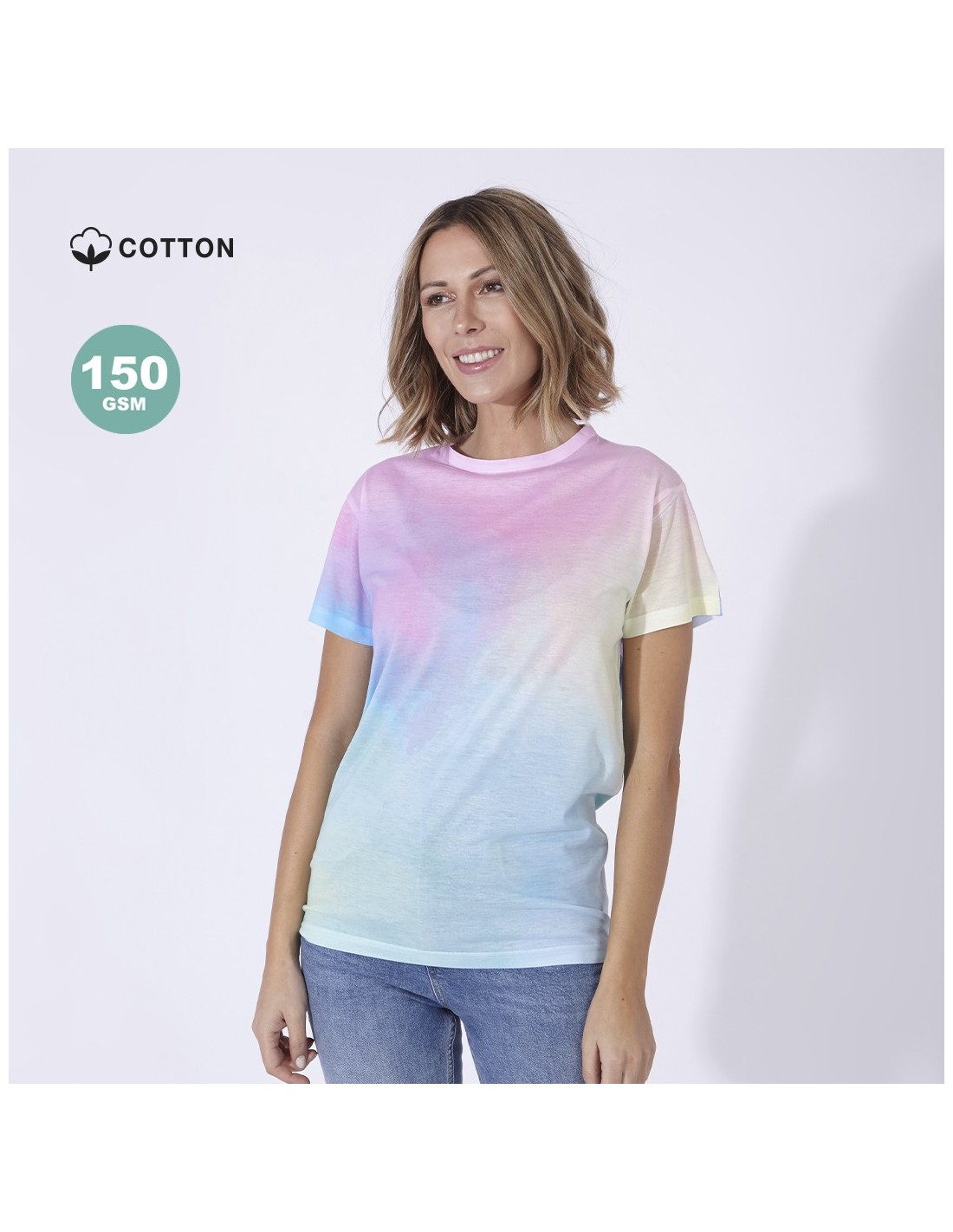 Camiseta unisex con estampado multicolor efecto arcoíris. Confeccionada en 100% algodón peinado Ring Spun de 150g/m2. Tacto suave y corte moderno. Cuello redondo estrecho en canalé 2x2. Doble costura en dobladillo y mangas para una mayor durabilidad y resistencia al uso intensivo. Etiqueta fácilmente removible. Disponible en tallas XS, S, M, L, XL y XXL.