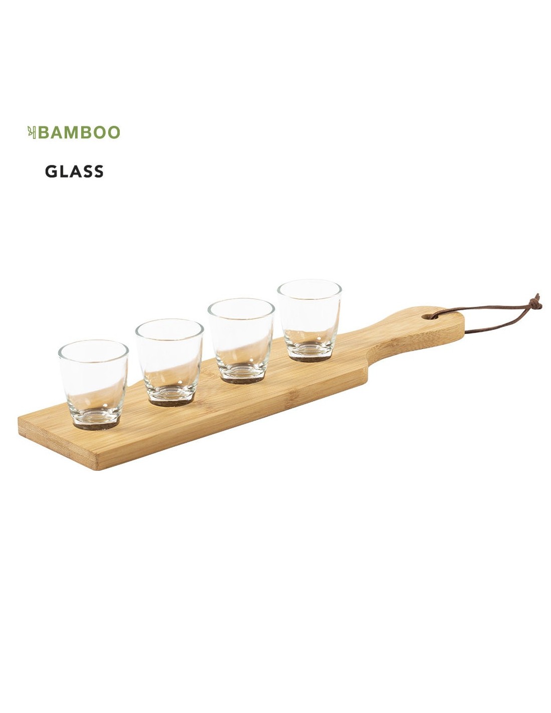 Bandeja de chupitos fabricada en bambú, para así fomentar el uso de materias primas naturales. Incluye 4 vasos de cristal de 30ml de capacidad y cinta de transporte. Presentado en caja individual de acabado kraft.
