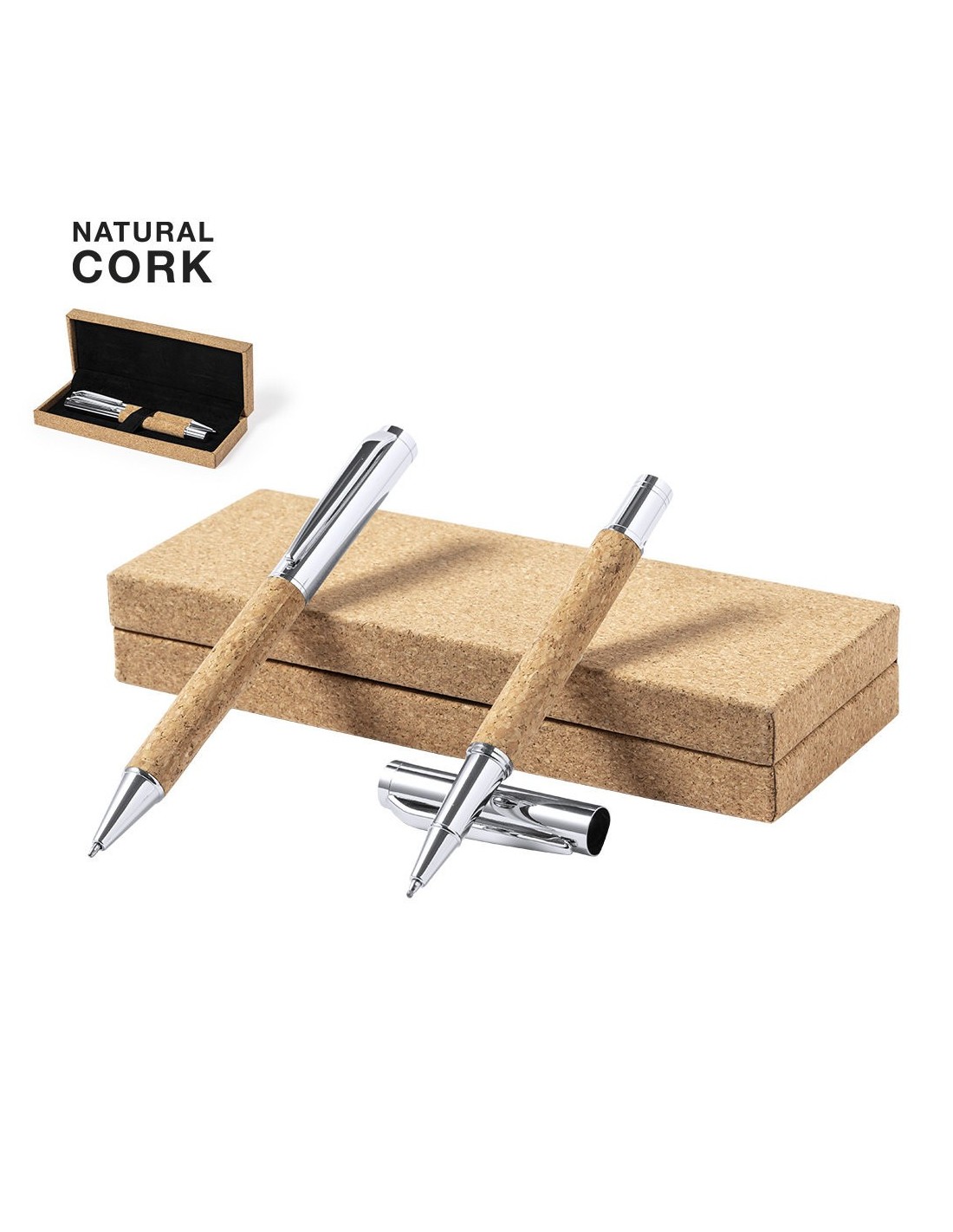 Set de bolígrafo y roller de línea nature. Fabricado en combinación de corcho natural con metal, para así fomentar la utilización de materias primas naturales y reducir las emisiones contaminantes. Bolígrafo de mecanismo giratorio en tinta azul. Roller con capucha y tinta gel en azul, con carga jumbo metalizada. Presentado en estuche individual de corcho con interior en antelina.