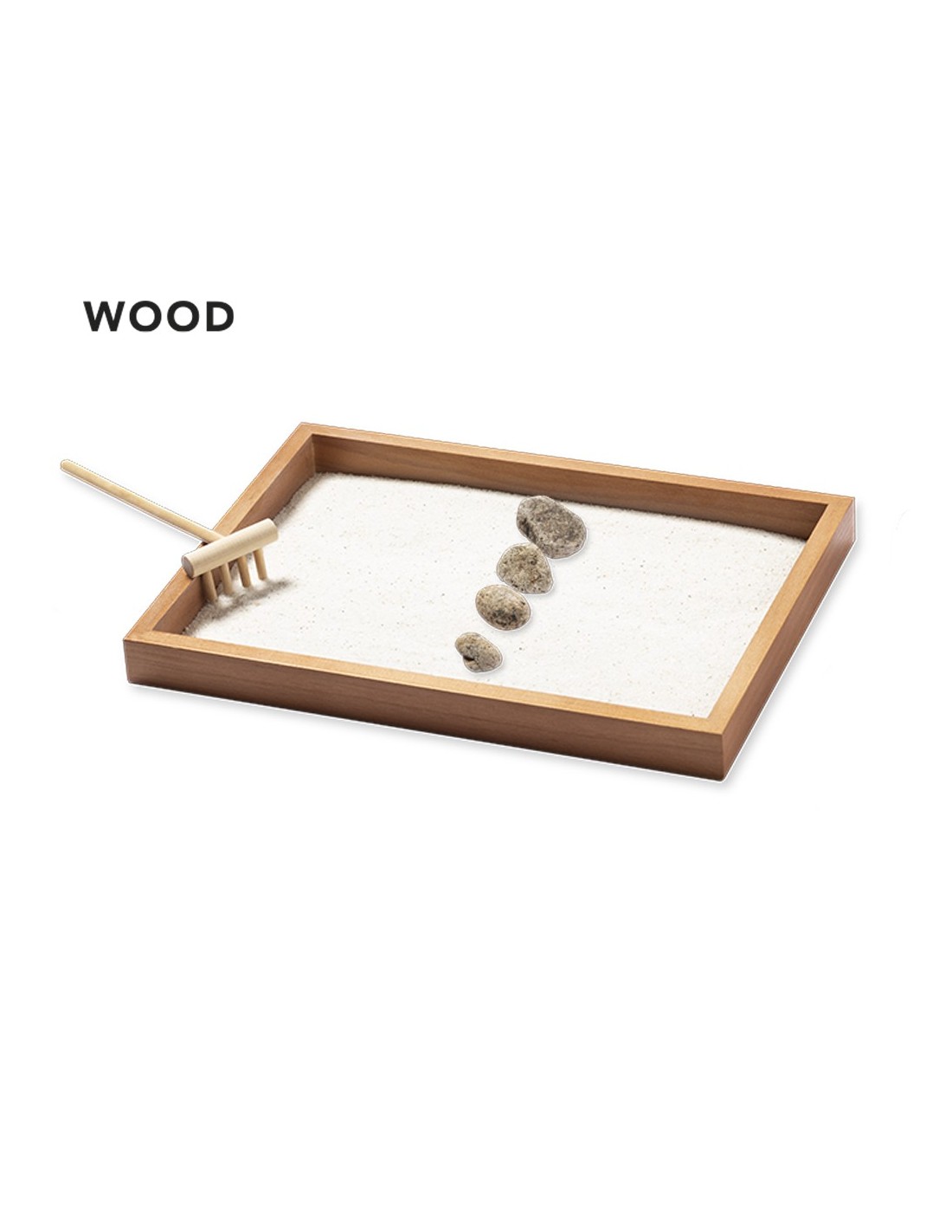Mini jardín Zen para la relajación y paz interior. Base contenedora y rastrillo fabricados en madera natural, con 4 piedras naturales y saquito de arena blanca. Presentación en caja individual de diseño kraft.