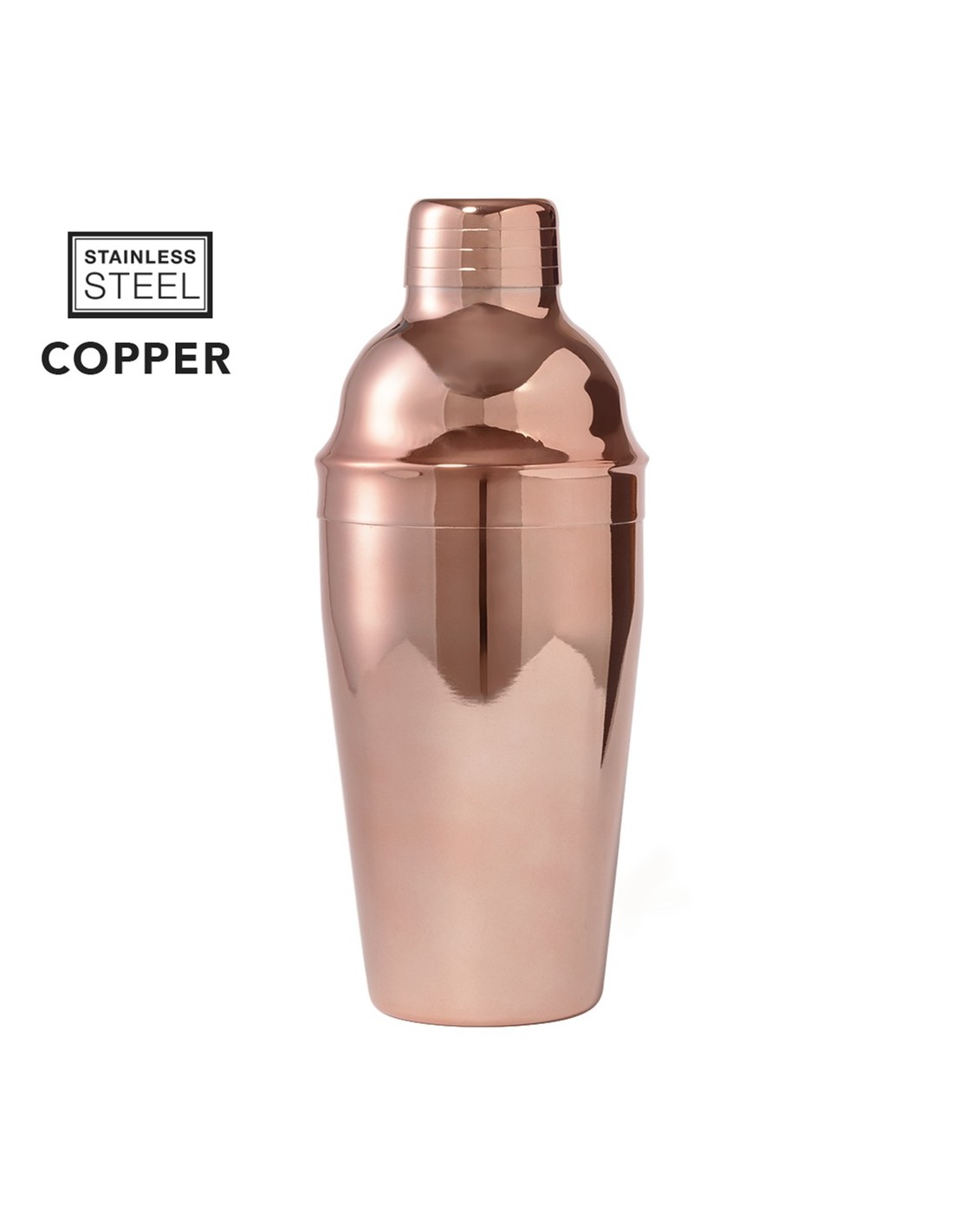 Cocktelera de 550 ml de capacidad en acero inox y recubrimiento exterior de cobre galvanizado. Con cierre de seguridad y tapón dosificador en parte superior. Presentada en atractiva caja individual de diseño.