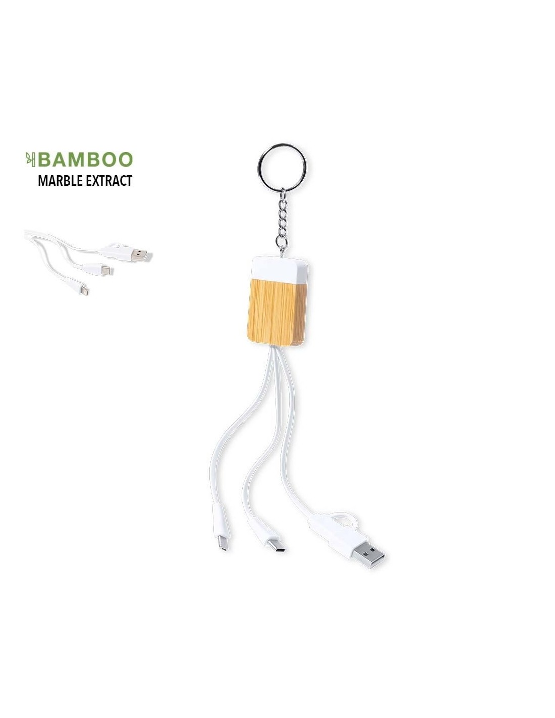 Cable cargador con llavero, fabricado en bambú y con detalle en extracto de mármol. Incluye conexiones de entrada USB y Tipo C, con salidas Lightning, Micro USB y Tipo C 5VDC 2.4A. Presentado en bolsa individual de diseño kraft.