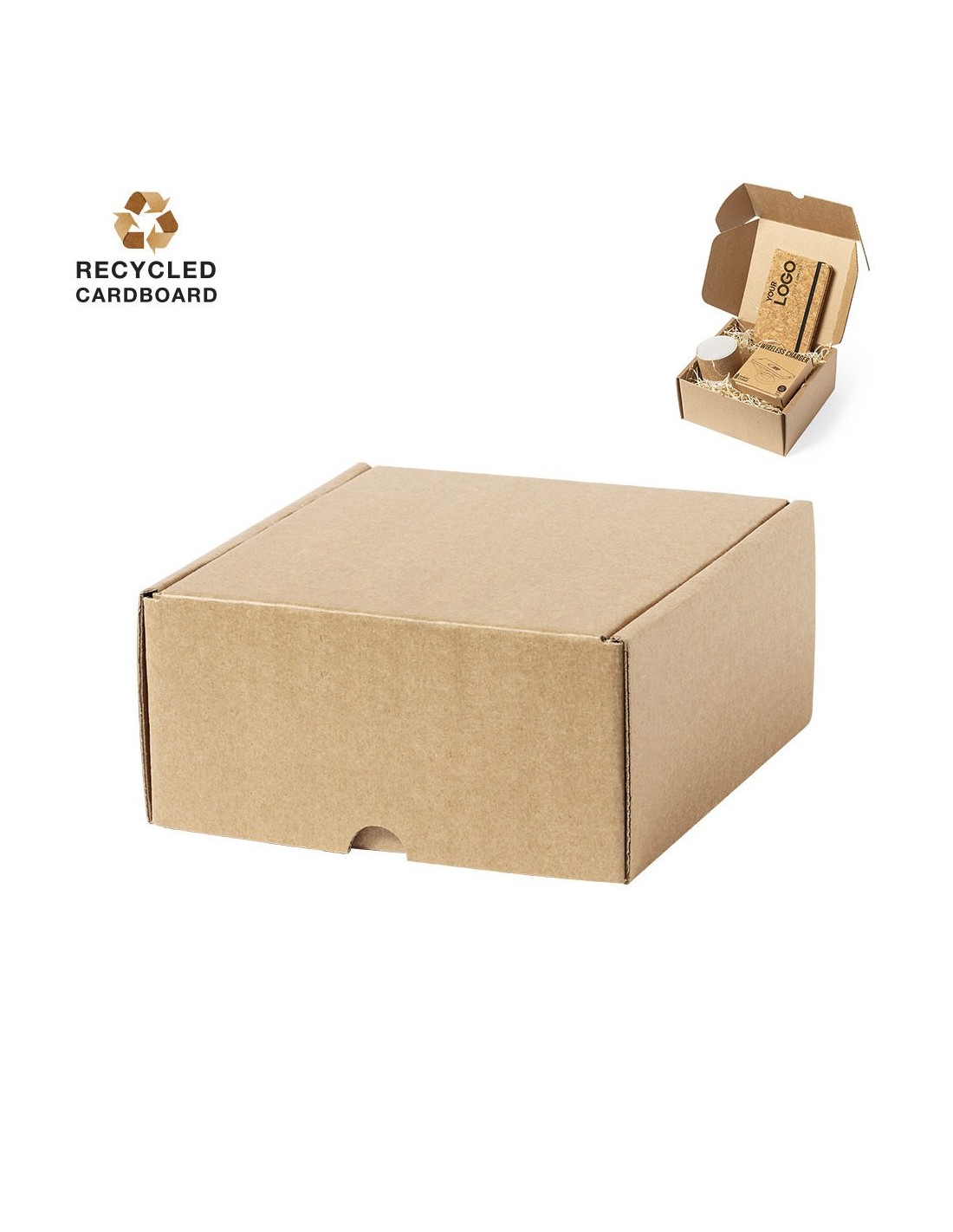 Caja de presentación tamaño S, fabricada en cartón reciclado corrugado y acabado kraft. En línea con la tendencia del mercado hacia la sostenibilidad integral del regalo, ofreciendo soluciones de origen reciclado con el fin de ayudar a la mejora y conservación de nuestro planeta.