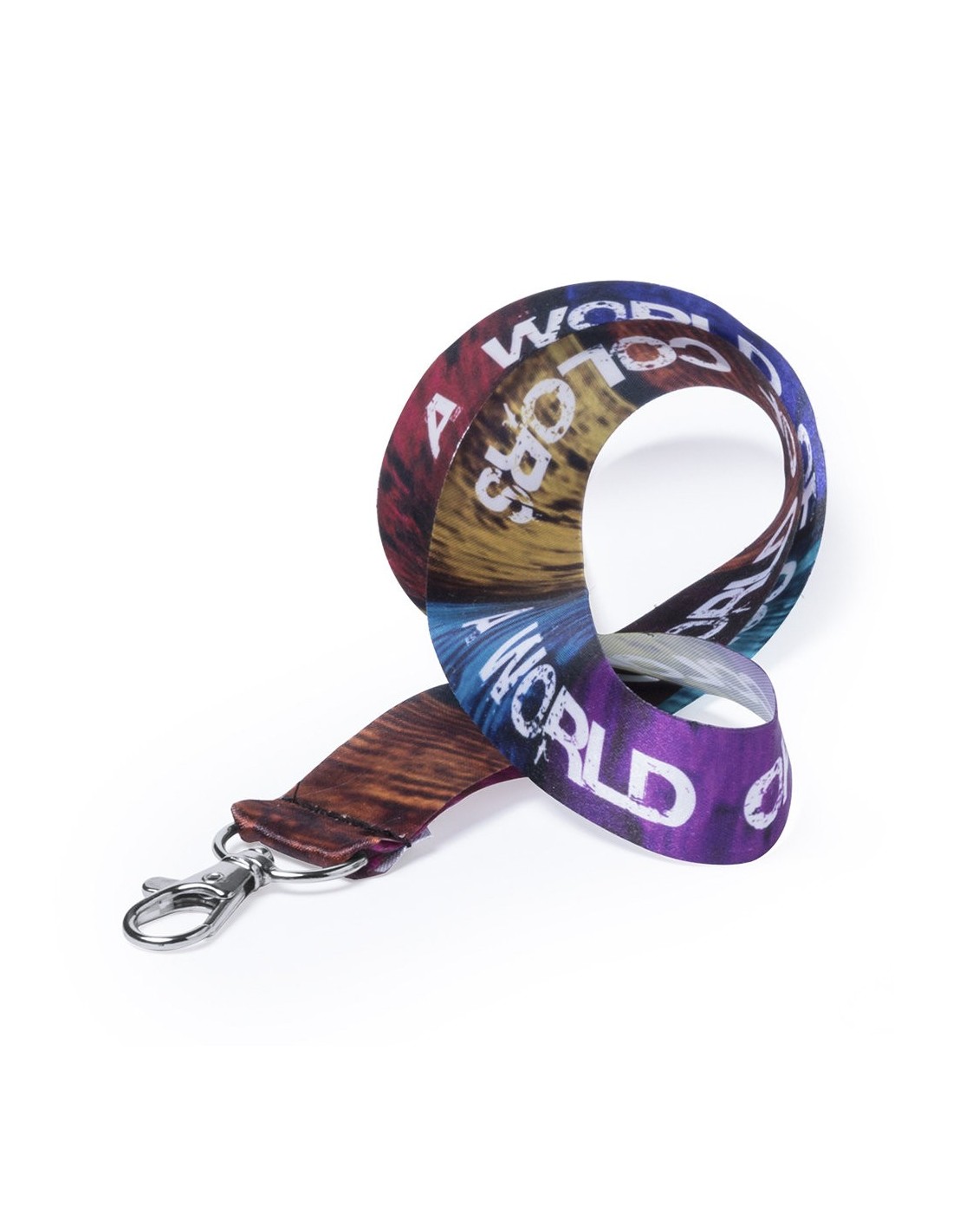 Lanyard con tiras de ancho especial en resistente y suave poliéster con accesorio mosquetón metálico. Especialmente diseñado para personalización total en sublimación para pedidos a partir de 250 piezas.