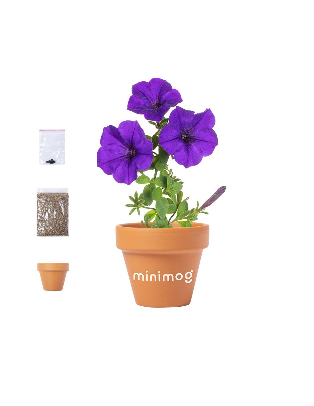 Maceta con flores de petunia. Incluye macetero fabricado en resistente terracota con agujero de drenaje + 5-8 semillas de petunia, con bolsita de sustrato para un correcto crecimiento. Presentada en atractiva caja individual de diseño. Disponible manual de instrucciones en español e inglés.